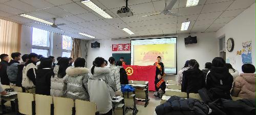 全体师生展团旗,唱团歌 团员们展团旗、唱团歌,重温入团誓词。薛晶向同学们讲述了实验室安全规范,说明了进入实验室前的着装要求、处理简单安全问题的方法措施,还对团员们就实验室问题做出了要求:态度严谨,不容忽视。随后她播放了一段实验室安全视频,向同学们展示了实验室中的不当操作引起的事故,使团员们对实验室不当操作所产生的危害有了更加深刻认识。在互动环节,团员们积极指出平时在实验室操作中的问题,并进行热烈讨论。