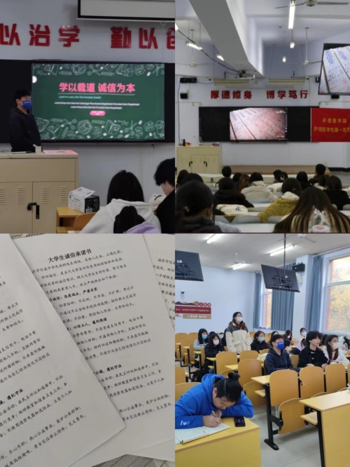 为深入学习贯彻中国共产党第二十次全国代表大会精神,进一步推进学校廉政文化建设和廉洁教育工作,大力营造崇廉尚洁的校园文化氛围,护理系2021级联合护理系学生第一党支部于2022年11月举办“坚守廉洁诚信底线,弘扬浩然清风正气”主题系列活动。本次活动共分为五部分。 “敬廉崇洁,诚实守信”诚信教育活动 11月8日下午,开展“学以载道,诚信为本”主题班会活动,班会从培养学生廉洁修身,诚实守信等方面展开。在“诚信学习大家谈”活动中,同学们积极讨论并将自己所思所感以便利贴形式张贴到黑板上。班级制定“班级诚信公约”,同学们学习后郑重签字,促使廉洁诚信思想深入人心。 (点击每张图片即可查看原图)
