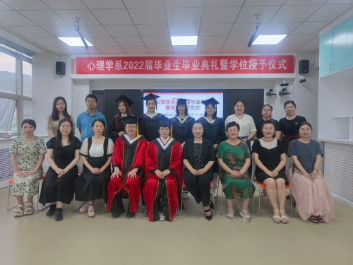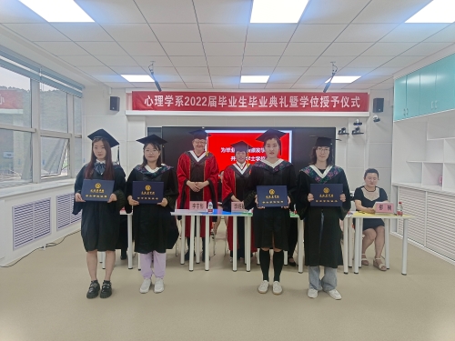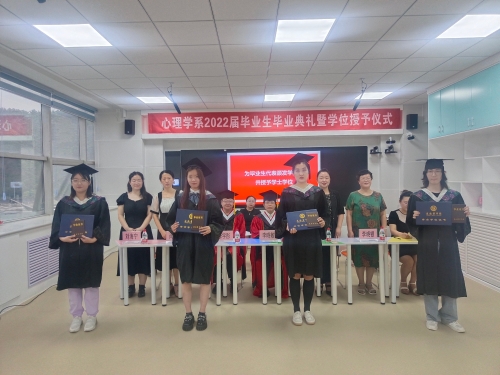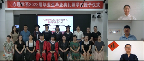 2022年6月21日,心理学系2022届本科毕业生云毕业典礼暨学位授予仪式在护理心理楼409教室和线上直播间同步举行。心理学系全体教师、全体毕业生共同出席,相聚云端。典礼由辅导员柳楠主持。 典礼在校长唐世英教授寄语毕业生的讲话中拉开序幕,心理学系党总支书记龚理宣读心理学系2022届本科毕业生学位授予名单,党总支副书记徐晓惠宣读优秀毕业生名单。心理学系主任李晓敏、副主任李宇彤及教师代表为毕业生代表颁发毕业证、学位证并授予学位。 难忘师生情,师生互赠离别礼物后,2022届毕业生代表于清华代表全体毕业生发言。她回顾了四年来在母校的成长历程,深情表达对母校和全体老师的感激之情,并表示将携带母校的祝福、恩师的期望,用所学报效祖国、服务社会。 学校教师基本功大赛一等奖获得者、天津师范大学在读博士李宝芬副教授作为教师代表发言,她向毕业生提出了叮咛和嘱托:希望大家能够保持热爱,保持心理学人的初心,树立远大理想,将心理学继续发扬光大。 最后,李晓敏教授致辞,她借用“东方甄选”的主播董宇辉的话语告诫毕业生:“人生短期拼智力,中期拼毅力,长期拼体力,不要觉得自己落后了,要用马拉松的心态去过这一生。”她祝愿毕业生能以一颗敏锐而包容的心去认识自己和世界,更坚强、更豁达地与自己和世界和解,拥有心理学所赋予的改造自己和世界的智慧和勇气,谱写独一无二的美丽人生。 典礼在师生依依惜别、恋恋不舍中圆满落幕。 祝福2022届毕业生从“心”出发,一路精彩! (点击每张图片即可查看原图)