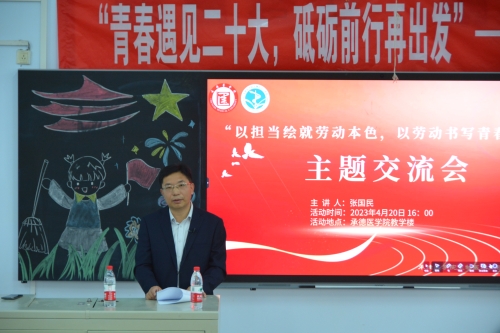 为弘扬劳动精神、奋斗精神、奉献精神,教育引导学生树立正确的劳动观,努力形成适应新时代要求的思想观念、精神面貌、文明风尚、行为规范,生物医学工程系学生党支部于2023年4月20日在教学楼402教室举办“以担当绘就劳动本色,以劳动书写青春华章”主题交流会,特邀全国五一劳动奖章获得者——承德医学院附属医院感控处处长张国民担任主讲人。生物医学工程系党总支副书记张静敏、辅导员杨晓婧、张晓妍、劳动教育课授课教师贝翠琳、生物医学工程系学生党员及2021级、2022级全体学生,共计300余人参加此次活动。 张国民曾先后获得全国卫生健康系统新冠肺炎疫情防控工作先进个人、河北省优秀共产党员、河北省抗击新冠肺炎疫情先进个人等荣誉称号,并于2021年荣获全国五一劳动奖章。通过观看视频短片,师生重温了张国民主动请缨、驰援武汉抗疫一线的感人事迹。交流会上,张国民讲述了自己及团队在武汉市江岸方舱医院的工作经历,真诚地与大家分享了在防护服上绘画、跳广场舞、医患相互鼓励等反映疫情防控特殊时期医患情谊的故事。他以自身的经历和实际行动深刻诠释了爱岗敬业、甘于奉献、大爱无疆的医者情怀,彰显了共产党员的责任与担当。 (点击每张图片即可查看原图)