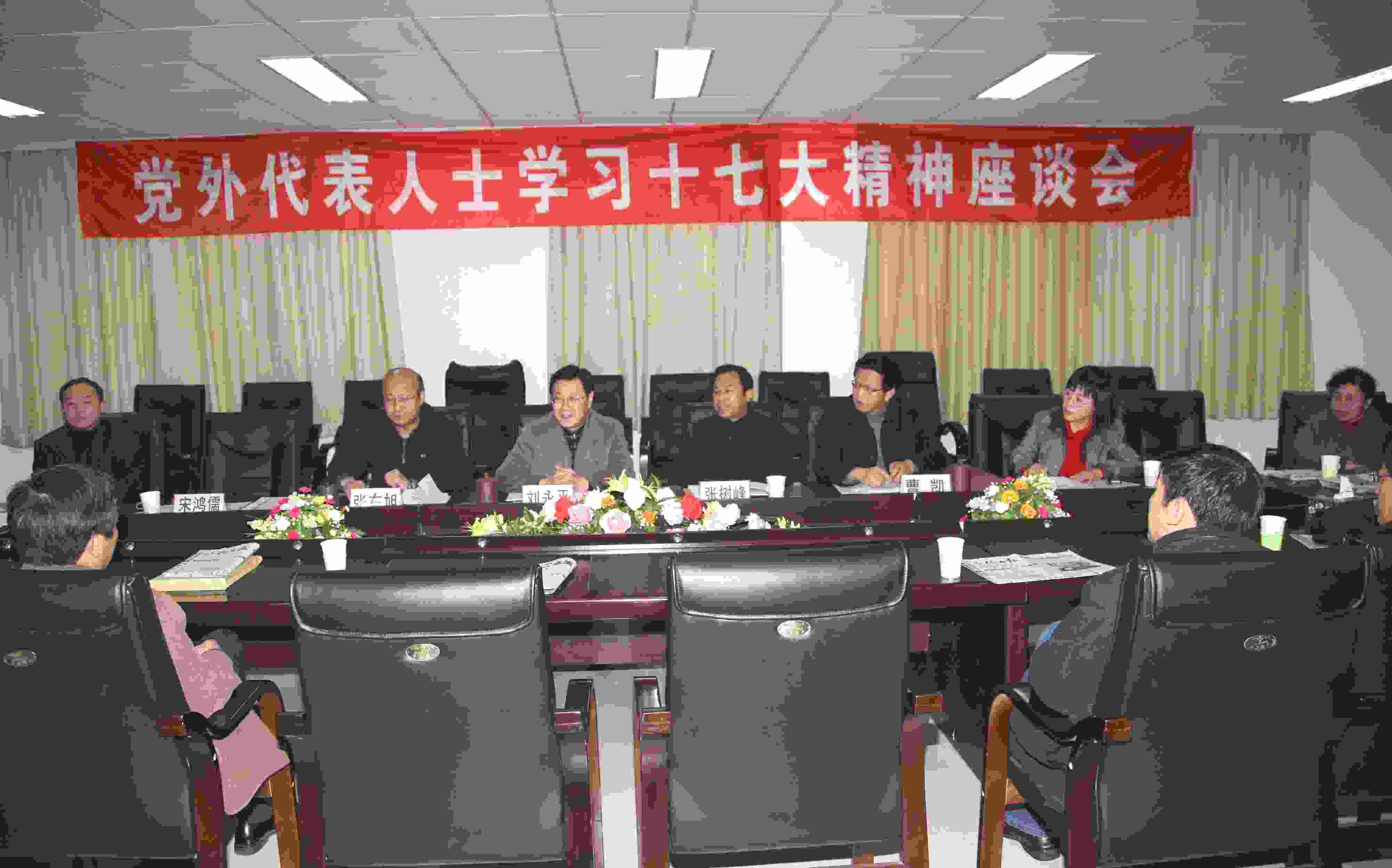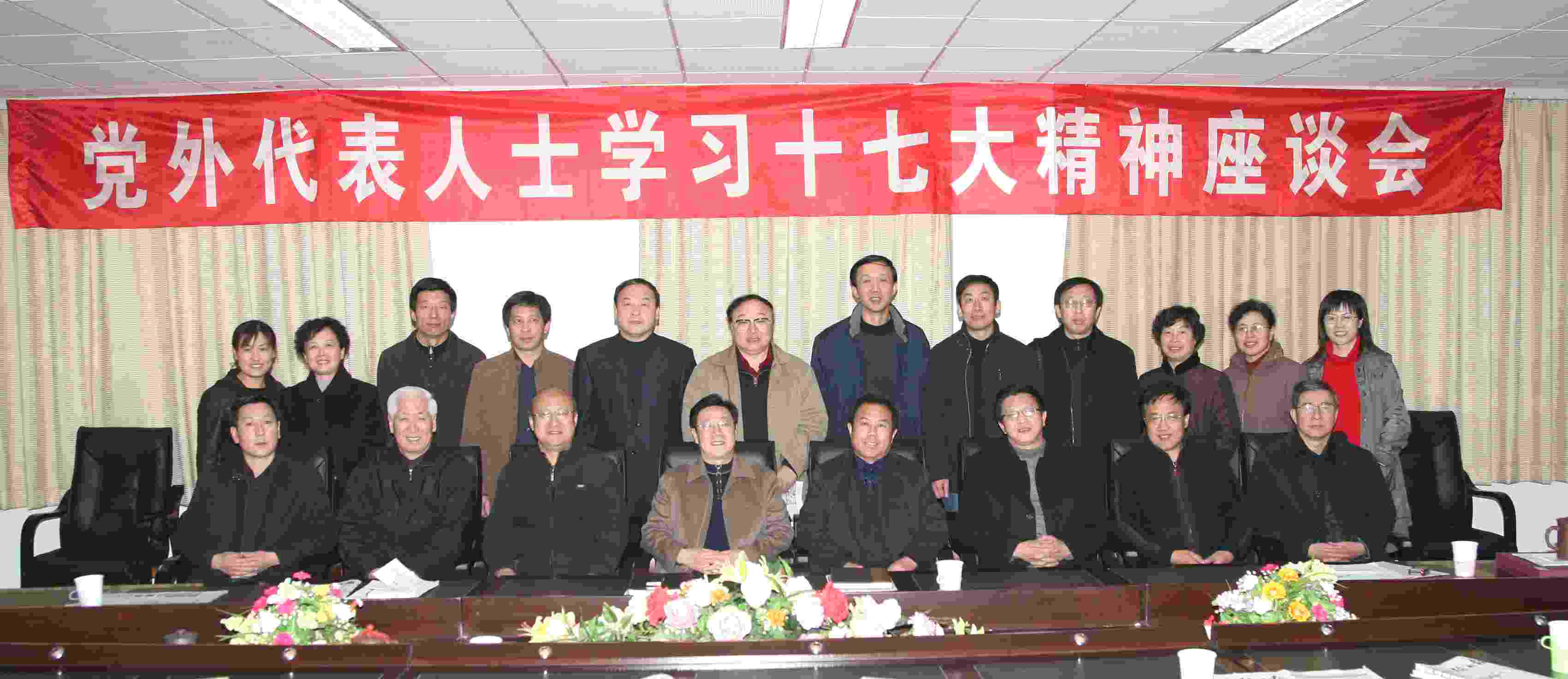 2007年11月15日,我院党外代表人士学习十七大精神座谈会在学院行政楼二楼会议室召开。院本部及附属医院六个民主党派的代表、无党派人士代表共十四人参加了座谈会。学院党委书记刘永平、院长张树峰、副书记张东旭、副院长曹凯、宋鸿儒、薛景凤,党委常委组织部长朱伟民、宣传统战部长赵书云,附属医院宣传部长李民出席了会议。
