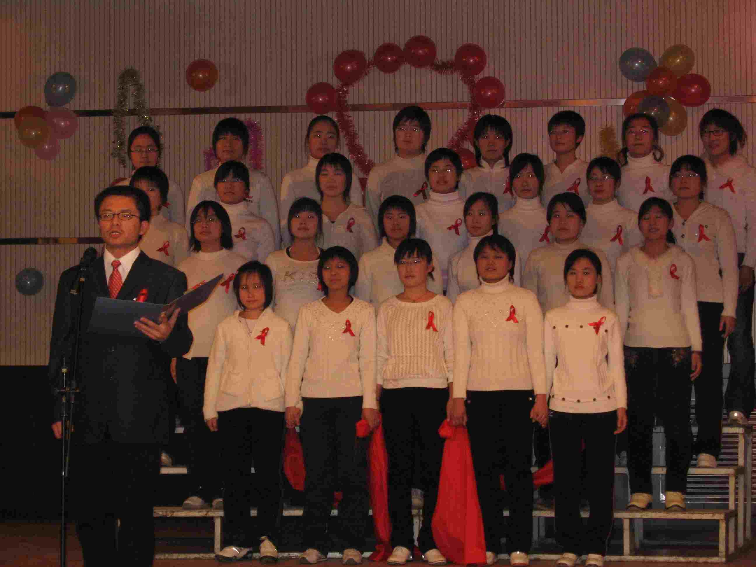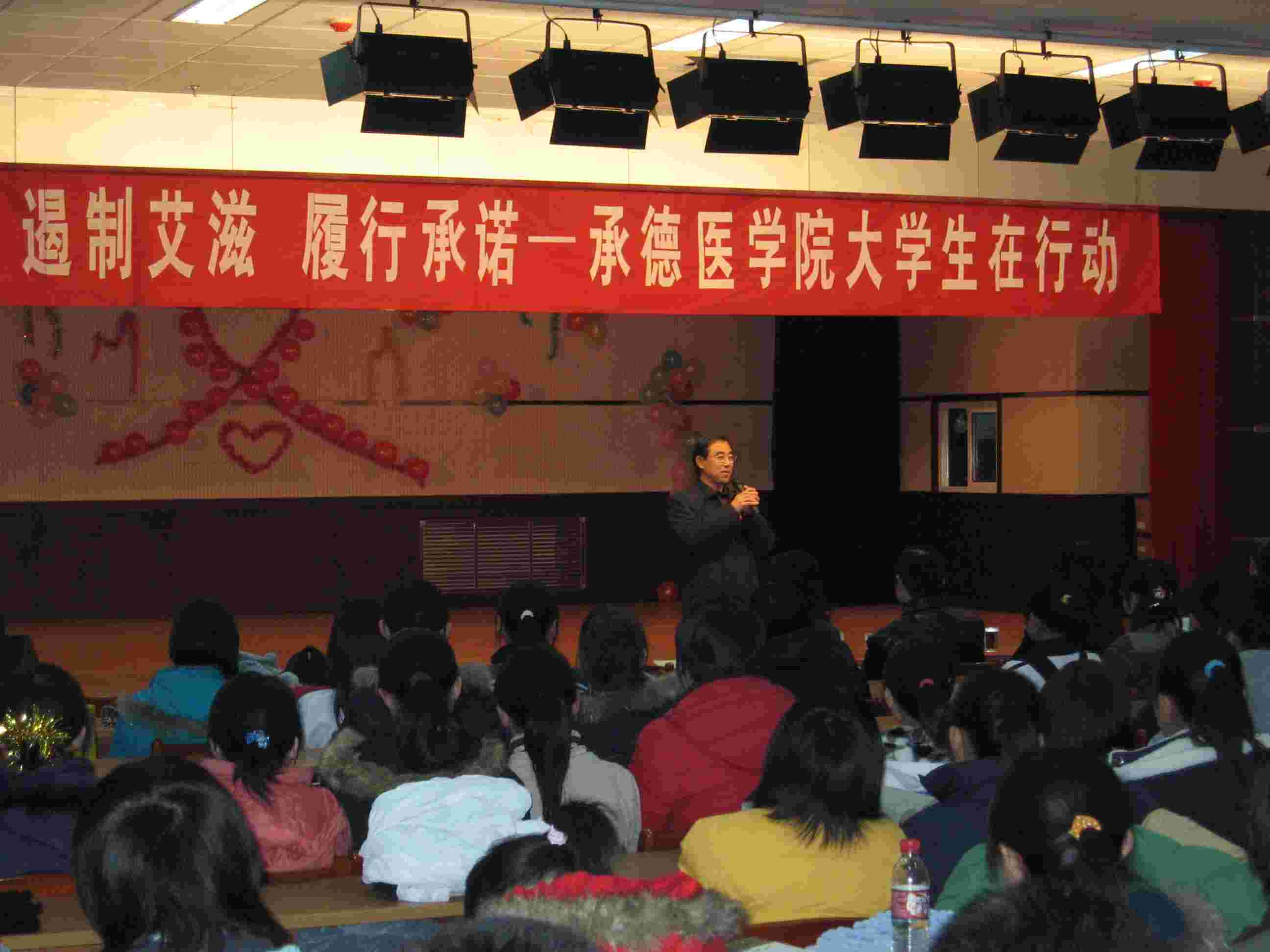 在第20个世界艾滋病日到来之际,为加强对大学生艾滋病防治宣传教育,激励大学生参与社会艾滋病防治宣传教育活动,承德医学院大学生红丝带协会在学院团委、全球基金艾滋病项目组和承德市疾病预防控制中心的支持下,于2007年11月30日,在学院图书馆八楼多功能厅组织了“遏制艾滋 履行承诺――承德医学院大学生在行动”主题文艺演出。近百名大学生积极参加节目准备,并自行创作了诗朗诵“庄严的承诺”、话剧“爱在阳光下”等节目。“遏制艾滋  履行承诺------承德医学院大学生在行动”文艺演出,以男女声二重唱“飘动的红丝带”开场,以大合唱“祈祷”结束。大学生红丝带协会通过在全校范围内征集文艺节目,使大学生在文艺节目的准备和演出过程中,受到了一次非常好的艾滋病防治宣传教育,学院党委副书记王振方、党委常委宣传部长赵书云、全球基金项目组负责人、学院高等医学教育研究室主任王岩教授、学院团委书记魏宁、基础部党总支副书记吴杰等参加了本次活动。承德市疾病预防控制中心性病艾滋病科科长王翠华出席了本次活动。250多名大学生观看了文艺演出,并对以文艺演出的形式开展大学生艾滋病防治教育的形式予以较高评价。