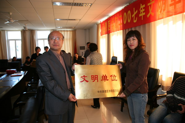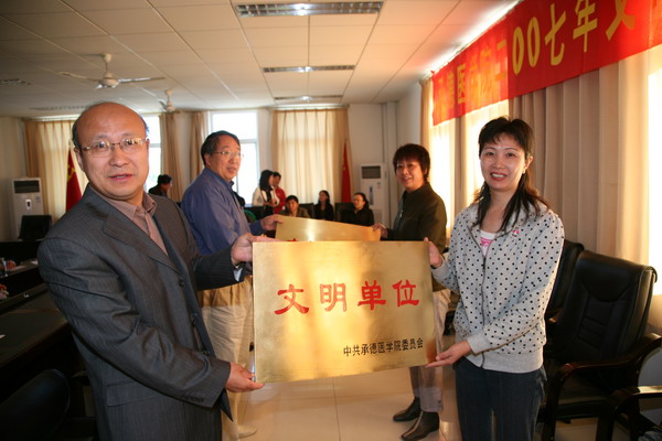 张一模副院长宣读了表彰决定。为表彰先进树立典型,进一步推动我院精神文明建设工作深入开展,根据各部处系推荐,经学院精神文明建设委员会量化考评,学院党委会审议通过,决定授予基础部等8个单位为2007年度“文明单位”,组织部等12个单位为“先进单位”,教务科等36个科室为“文明科室”,“病魔无情人有情,扶危济困献爱心”等十件好事为2007年度“学院十件好事”。颁发牌匾、证书和奖金。