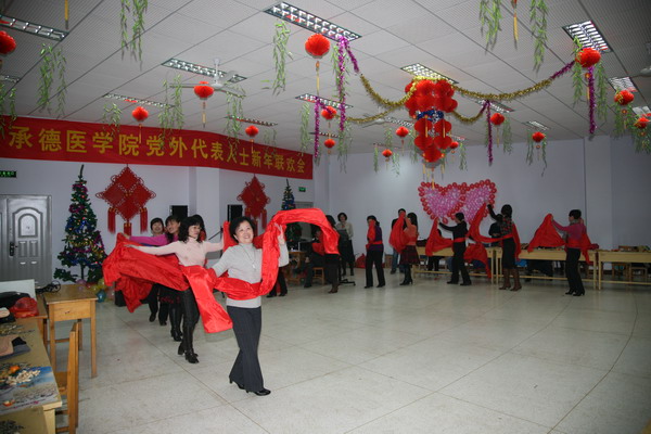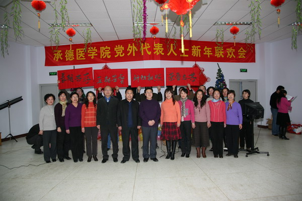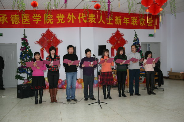 2008年12月25日是西方传统节日圣诞节,在2009年新年到来前夕,学院党委举办以“团结奋进合作,构建和谐承医”为主题的新年联欢会。学院艺术活动中心二楼会议室张灯结彩,大红的中国结,流光溢彩的圣诞树,红红火火的灯笼把这里装点得喜庆、祥和、热烈。我院民主人士和无党派代表人士欢聚一堂,喜迎新年。承德市原农工民主党名誉主委、承德市政协副主席、第九届全国人大代表、附属医院顾问马家骥教授出席了联欢会。学院党委书记刘永平、副书记、院长张树峰、党委副书记兼纪检书记王振方、党委副书记张东旭、党委常委组织部长朱伟民、宣传统战部长赵书云及学院相关部处系负责人代表、博士代表出席了联欢会。