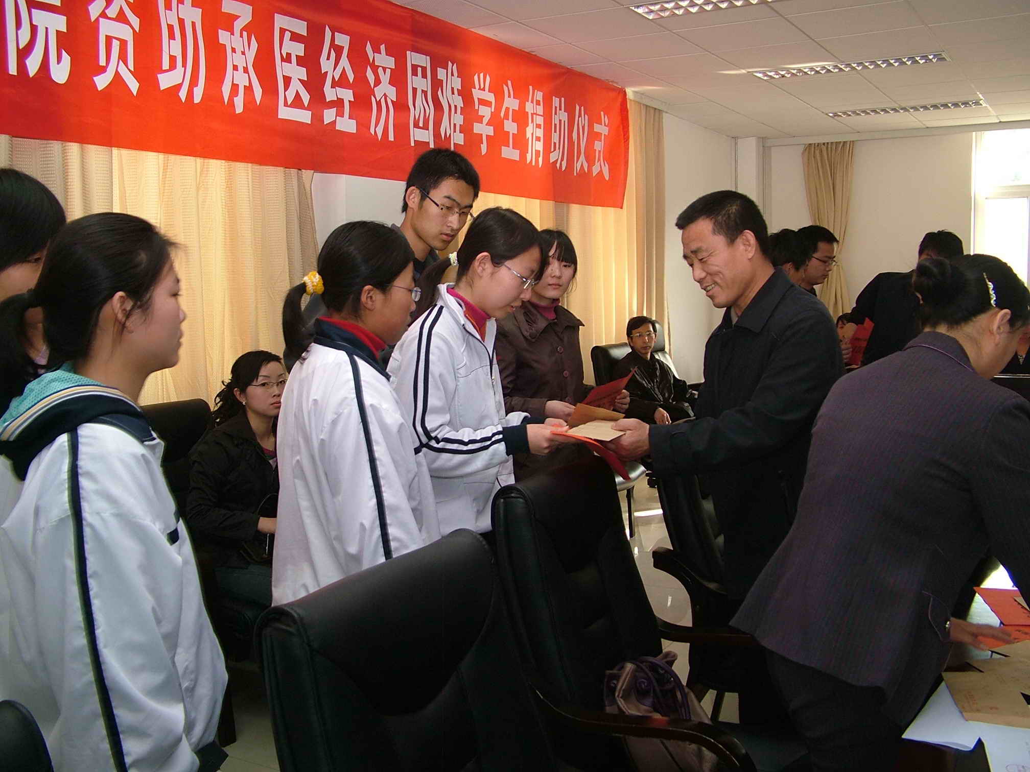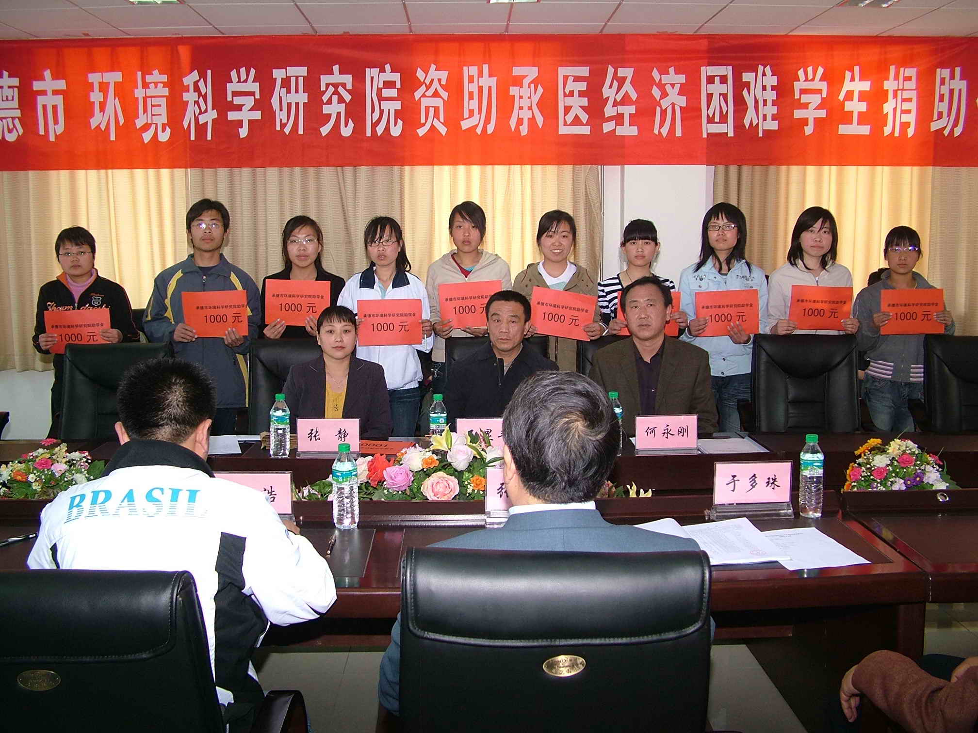 学生处于多珠处长、副处长沈浩、各部系的主管领导和辅导员,得到资助的20名学生均提前到场,学院张一模副院长代表学院领导参加了捐助仪式。会议由于多珠处长主持,在首先介绍了到场的领导和参会人员之后,于处长主要说明了我院学生处这次受资助学生评审的原则、条件,评审程序及过程。沈浩副处长随后宣读了受资助学生名单及其基本情况,环境研究院的领导亲自将资助款逐一交到学生手中。王院长表示:这样做只是尽己所能为家庭困难学生尽一点义务。这项资助会一直延续下去,如若同学们在校期间遇到突发性的事件需要帮助,还可以提供另外的资助。希望大家珍惜机会,努力学习,不断增长能力,将来回报社会。王院长还向大家介绍了承德市环境科学研究院的职能、业务范围,欢迎同学们去那里进行更广泛的交流。受资助的学生深受鼓舞,纷纷发言,表达自己的感激之情,并决心发奋学习,不断拼搏,改变命运,将来传递爱心,回报社会。