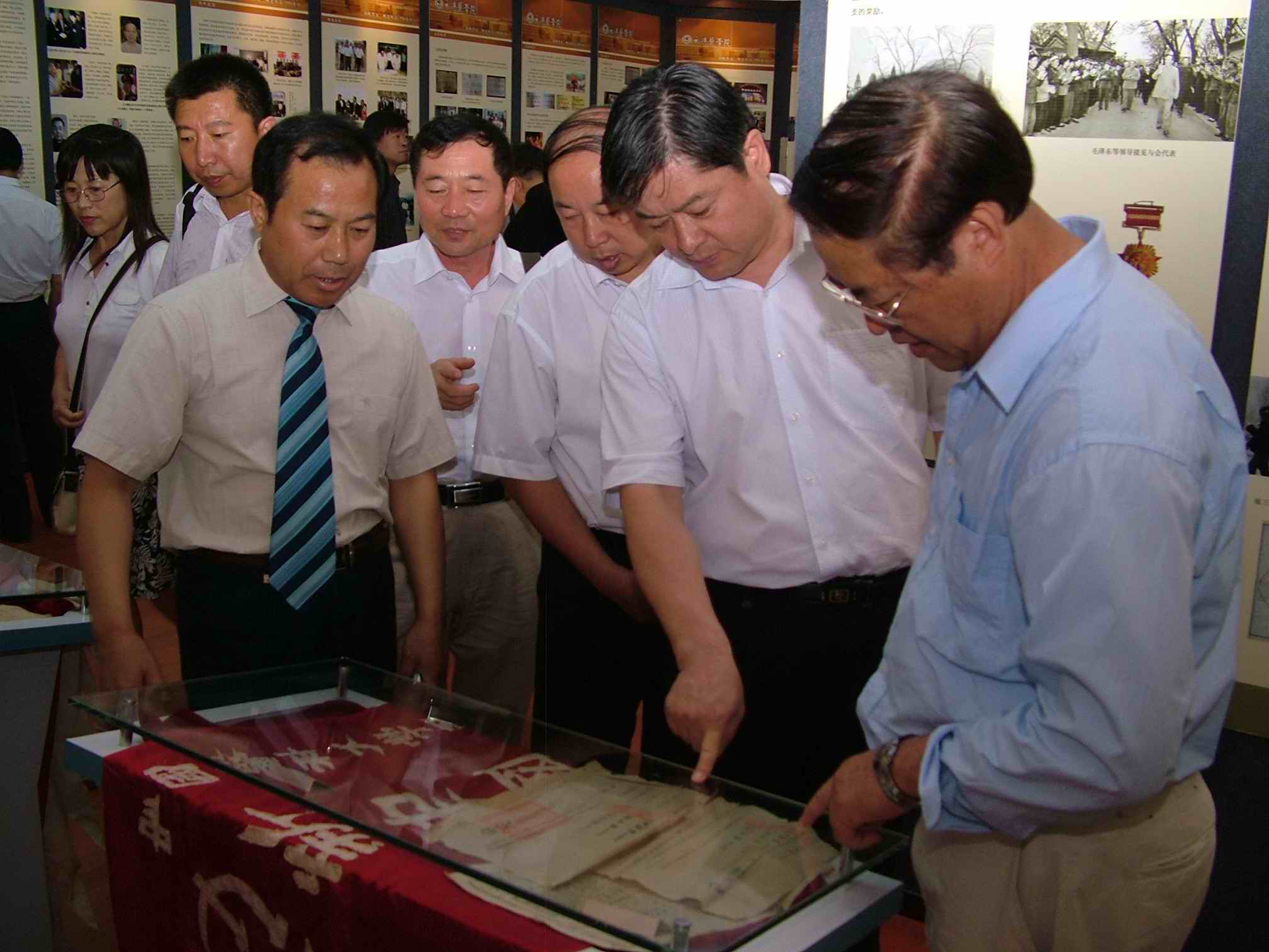 孙宝志教授(右一)赵群校长(右二)戴万津书记(右三)张树峰院长(左一)参观我校校史展,对1948年冀察热辽军区政委、副政委黄克诚,黄火青发布的军区人员任命命令格外关注。