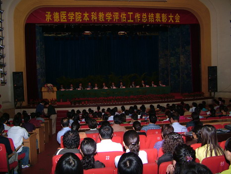 巩固教评成果,再谱辉煌新篇。9月10日是我国第24个教师节,也是教育部教评专家组进校评估一周年纪念日。2008年9月10日上午,承德医学院本科教学评估工作表彰大会在承德剧场隆重举行。特邀嘉宾国家教育部原高教司副司长、评估中心主任刘凤泰、河北工业大学副校长、省教育厅教学评估督导组组长展永、学院领导刘永平、张树峰、王振方、张东旭、张一模、曹凯、宋鸿儒、薛景凤,附属医院院长杨宗伟、市中心医院院长李建华等在主席台就坐。学院师生一千余人参加了表彰大会。