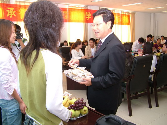 刘永平书记做中秋茶话会致辞。刘书记首先借全体四川籍学生向我院所有外省籍同学致以中秋节的问候,祝广大同学身体健康,学业有成。他在讲话中,回顾了四川汶川特大地震以来我院所采取的各种救助以及帮扶措施,还介绍了我院的一些长期关怀举措,并鼓励四川籍同学要更加坚强的生活,更加努力的学习,以最好的成绩回报社会。接着刘书记等学院领导还询问了四川籍同学的学习生活,并表示将尽全力解决大家生活中的困难。刘书记表示,在这中秋佳节的美好时刻,让我们共享一轮明月,重献一份爱心,再创美好明天。