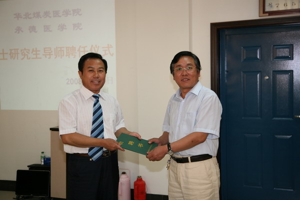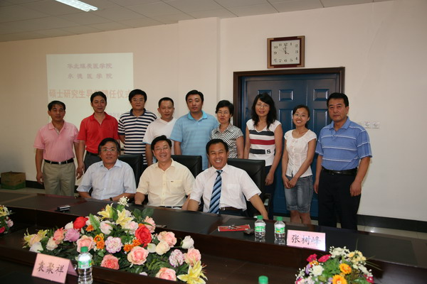为加强学科及研究生导师队伍的建设,根据承德医学院与华北煤炭医学院联合培养硕士研究生有关协议,2008年7月13日上午,华北煤炭医学院硕士导师聘任仪式在我院举行,我院有11位教师被华北煤炭医学院聘为硕士研究导师。