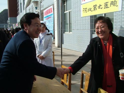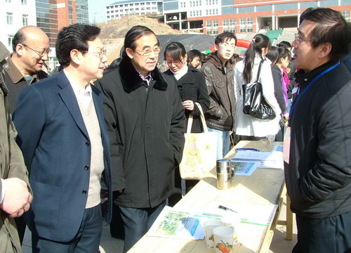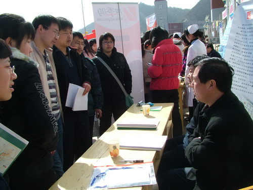 3月14日,春寒料峭,乍暖还寒,行进在前往医学院的路上远远地会看到通往校园的大桥两侧彩旗飘扬,听到校园里传出的阵阵锣鼓喧天,穿过两道巨大的彩虹门,两条高悬的横幅映入眼帘“热烈庆祝承德医学院2009届毕业生就业双选会召开”、“热烈欢迎用人单位领导光临我院”。 今年我院共有各专业毕业生1555人,来自北京、天津、山东和省内各地市的76家用人单位参加了招聘会,提供就业岗位约500个。来招聘的用人单位有医疗、制药、医疗健康和医疗器械公司等,所需人才包括了我院所有专业的毕业生。毕业生与用人单位初步达成意向的约230人,现场正式签约的有4人。 此次双选会学院领导给予了高度重视,学院党委刘永平书记、王振方、张东旭、张一模、宋鸿儒、薛景凤等出席了欢迎晚宴。在招聘现场,刘永平、王振方、张东旭书记亲切走访了用人单位,向他们表示慰问和感谢。我院院报学生记者就学子和用人单位关注的有关事宜对刘永平和王振方两位书记进行了现场采访。 学生处作为具体负责部门,从2008年11月起开始筹划双选会,为确保大会成功举行做了大量细致的准备工作。双选会前已派专人到各地与用人单位联系,上门拜访,邀请用人单位参加我院毕业生双选会。为克服新校区离市区远的困难,他们精心策划,煞费苦心地做好招聘会现场和代表接待工作。广大师生也积极支持双选会的举办,学生处、各部系领导、各毕业年级的学生辅导员到现场提供就业指导服务,向用人单位推荐毕业生,与单位建立良好的合作关系。还有300名学生志愿者在双选会现场志愿服务,为2009届毕业生双选会的成功举行提供服务保障,向与会代表展现了承德医学院学生良好的精神风貌。 据毕业学子反映,双选会真正为毕业生和用人单位提供了一个良好的双向选择平台。招聘会的组织工作受到了用人单位的高度赞扬,为今后毕业生就业工作的顺利开展奠定了基础。  学院领导在欢迎晚宴上向用人单位致意 党委书记刘永平(左)与前来招聘人才的肃宁县长(右)亲切握手 招聘单位工作台前 应聘学子们 学院党委书记刘永平(左二)、党委副书记王振方(左三)、张东旭(左一)等在现场慰问招聘单位工作人员