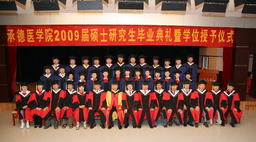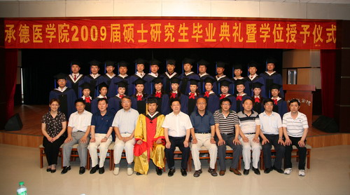 2009年7月6日下午,承德医学院2009届硕士研究生毕业典礼暨学位授予仪式在图书馆八楼多功能厅隆重举行。学校党委书记刘永平、院长张树峰、副书记张东旭、副院长张一模、曹凯、宋鸿儒、党委常委组织部长朱伟民、附属医院院长杨宗伟、2009届全体硕士毕业生、在校研究生及导师代表参加了大会。