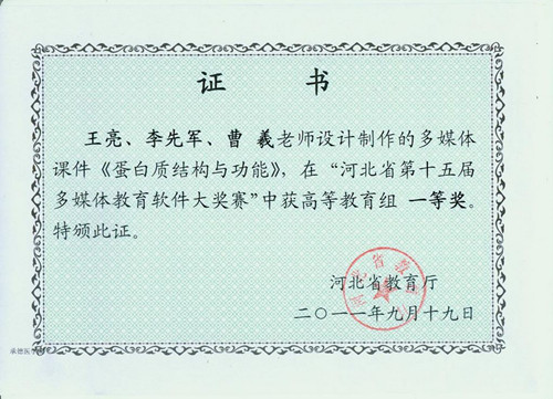日前,河北省教育厅公布河北省第十五届多媒体教育软件大奖赛结果,我校教师王亮、李先军、曹羲共同设计制作的多媒体课件《蛋白质结构与功能》获高等教育组一等奖。杨阔、刘镭、孙彦豹、谷俊改四名教师制作的课件分获大赛高等教育组二等奖。吴婷、王海燕、马征三名教师制作的课件分获大赛高等教育组三等奖。