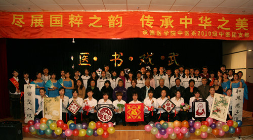 11月1日下午,中医系10级中医团支部以“尽展国粹之韵,传承中华之美”为主题的团日活动在八楼多功能厅举行。承德市文化局艺术科叶建军科长、西大街社区党支部支润芳书记,赵金侠副书记、学校美育教研室修俊雅主任、军事教研室于群主任、中医系党总支李晓杰副书记以及老干部处的老师们出席本次活动。