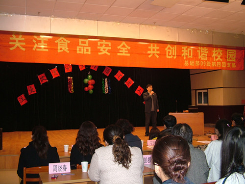活动伊始,副校长宋鸿儒作了致辞,对出席此次活动的来宾表示了热烈欢迎,充分肯定了活动的意义,并预祝活动举办成功。辛明霞所长发表讲话,表示希望和我校相关部门一起努力打造安全放心食堂,保证校园食品安全。随后刘伟超科长从今年发生的“双汇瘦肉精”事件入手,为大家讲解了食品添加剂的相关知识。董晓悦副所长就同学提出的食品安全问题予以解答。最后,我校后勤集团党总支书记王延君为此次活动作总结,他对校外领导的到来表示感谢,欢迎他们监督检查并予以指导。