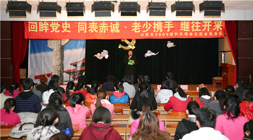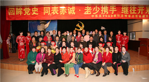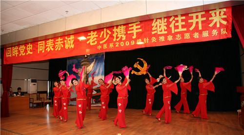为庆祝中国共产党成立90周年,讴歌中华民族实现伟大复兴的奋斗历程,4月1日下午,中医系2009级针灸推拿志愿者服务队在学校多功能厅举办了以“回眸党史同表赤诚 老少携手 继往开来”为主题的文艺汇演。承德市老年大学高印如副校长、学校团委沈浩书记、中医系党总支书记兼副主任梁广和教授等领导老师出席并观看了演出。
