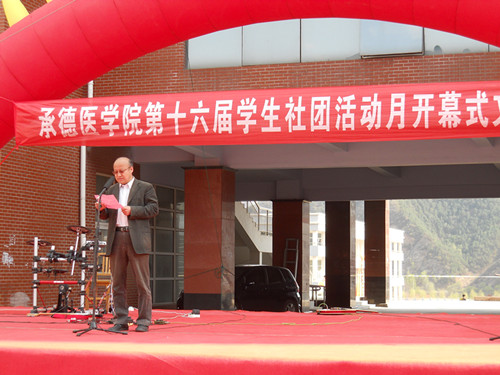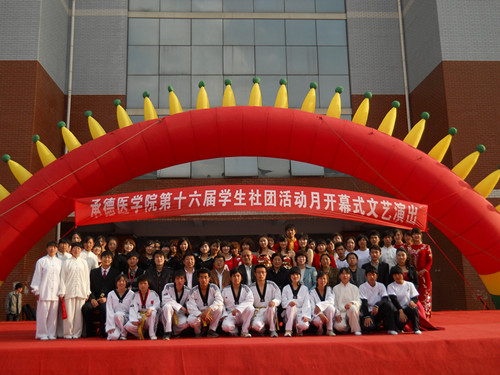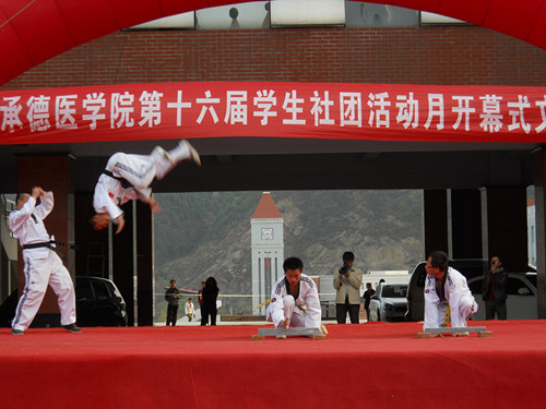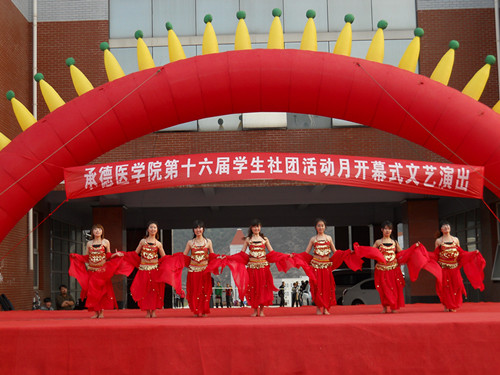 党委副书记张东旭致开幕词,他首先肯定了学校各社团对学校发展的积极推动作用,学生社团是建设和弘扬校园特色文化的一面重要旗帜,在提高大学生综合素质、促进学生成长成才和就业等多方面发挥着重要的作用。张书记还指出,在学校党委的高度关注下,社团现已成为了活跃校园文化生活、陶冶情操、提升综合素质的有效载体,成为了学生素质教育的有效依托,成为了主课堂外最活跃、最有效的学生教育主阵地。他希望社团组织以本次社团活动月为契机,不断加强社团品牌建设,丰富社团内涵建设,继续加强社团组织建设,增强吸引力和凝聚力,在活跃校园文化、服务学生成长成才等方面发挥更大的作用。最后他预祝社团月开幕式取得圆满成功。 开幕式文艺演出正式开始。由虹乐队带来演奏《午后三点》和《我自己》,动感的音乐、默契的配合博得同学们的阵阵掌声。音乐社、太极社、演讲社、武术社、舞蹈社、吉他社也准备了极具其社团特点的节目,受到同学们的热烈欢迎。这次活动不仅有社团参加,也有专业舞团的加盟,舞团成员高超的舞技折服了现场观众,尤其深受青年学生的喜爱。由跆拳道协会带来的跆拳道表演,更是博得满堂喝彩,演出在同学们热情的掌声和欢呼声中圆满结束。