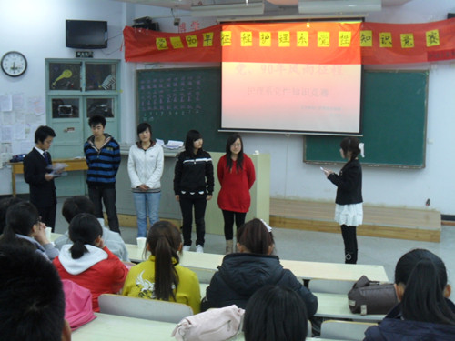 来自护理系08级、09级和10级共九个代表队参加了此次知识竞赛活动。活动以题目问答形式进行,分为必答题和抢答题。其中必答题由各代表队四个队员轮流进行答题,抢答题各代表队通过抢答器进行抢答,整个活动过程坚持公开、公平、公正的原则。现场同学们积极热情,活动过程中穿插观众互动,答对题的同学有精美礼品赠送,气氛十分活跃。活动现场打分,评出了一二三等奖,由出席的领导老师颁发奖状和礼品。