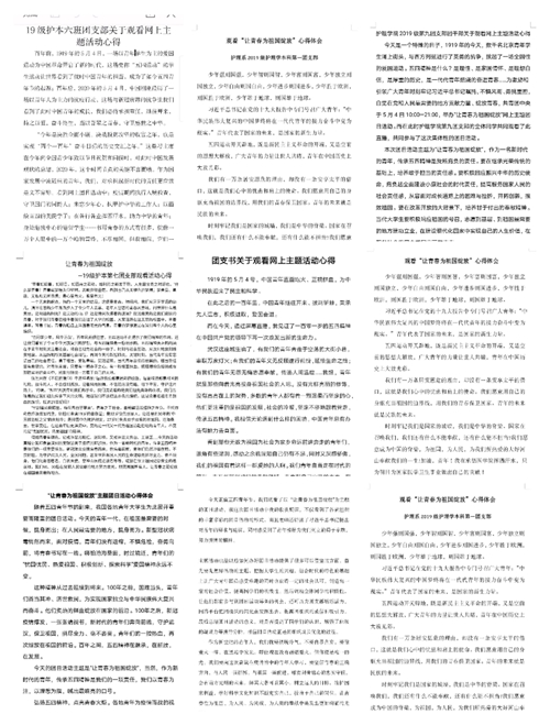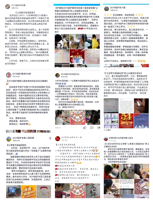 今年是五四运动101周年,百年历史横流中,一代又一代青年各守一方,在党和人民需要的地方绽放绚丽之花。新时代的学子应该追随他们的脚步,争做有志青年。为响应学校团委号召,传承五四精神,护理系2019级护理学本科全体学生于5月4日上午10时准时观看、学习共青团中央举办的“让青春为祖国绽放”网上主题团日活动。 五四精神传承有我。1919年5月4日,国难当前,爱国青年挺身而出。2020年5月4日仍有许多青年奉献在志愿者、突击队活动中,为抗击疫情坚守岗位。100多年来,“忧国忧民、热爱祖国、积极创新、探索科学”的五四精神代代相传,作为一名新时代的青年,传承五四精神应当是我们的一项重要任务。 同学们纷纷表示,“青年兴则国家兴,青年强则国家强”。今年新冠肺炎疫情暴发,在病毒面前,青年们冲锋在前、不畏牺牲,为守护武汉人民、全国同胞、甚至是世界各国人民的生命健康而拼尽全力。医护人员的一腔热血,再次绽放在保卫祖国健康安全的最前线。我们作为一名医学生,未来的医护人员,现在需要认真学习专业知识,日后投入到医学实践中,做新时代的爱国主义实践者。 描绘历史憧憬未来 悼念历史才能更好地追溯未来。在本次活动开始前,同学们以手抄报的方式展现了五四运动这一历史。每位同学在绘制手抄报的过程中认真体会到了五四精神的内涵,同时也明确了青年身上的责任与担当——以梦为马不负韶华。随后各班选取了优秀作品,并在班级群内进行了展示。 观看团日活动弥补自身不足 众所周知,优秀的团日活动可以增强团组织的凝聚力,同时也可以充分的调动青年的积极性。本次团中央的网上主题团日活动讲述了各地举办团日活动的成功经验。为把日后的团日活动做好做优,各团支部成员认真学习了此次网上主题团日,找出班级团日活动中的不足。同时每位团干部认真做好记录,活动结束后进行了总结,为今后班级的团日活动提供了指导。 做好宣传共度五四青年节 活动结束后,各班进行线上交流,每位同学积极参与。同时,以班级为单位宣传了本次活动,宣传效果良好,今年的五四青年节,每位同学与支部内其他成员一起度过,意义非凡。 通过本次主题学习活动,每位同学深深得领会到五四精神,并且会把这种精神落实到今后学习、工作以及生活的方方面面。同学们表示,作为新时代的青年,我们应该时刻保持头脑清醒和正确的认识。作为一名医学生,我们更应该积极投身到社会主义卫生事业之中。我们会以青春为注,以理想为旗,让青春为祖国绽放。