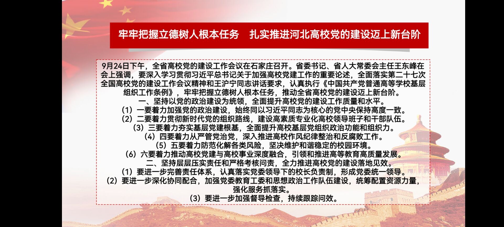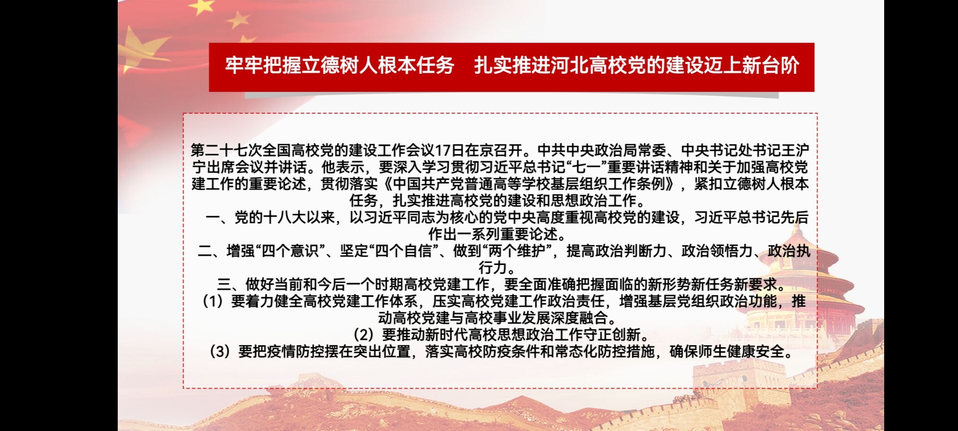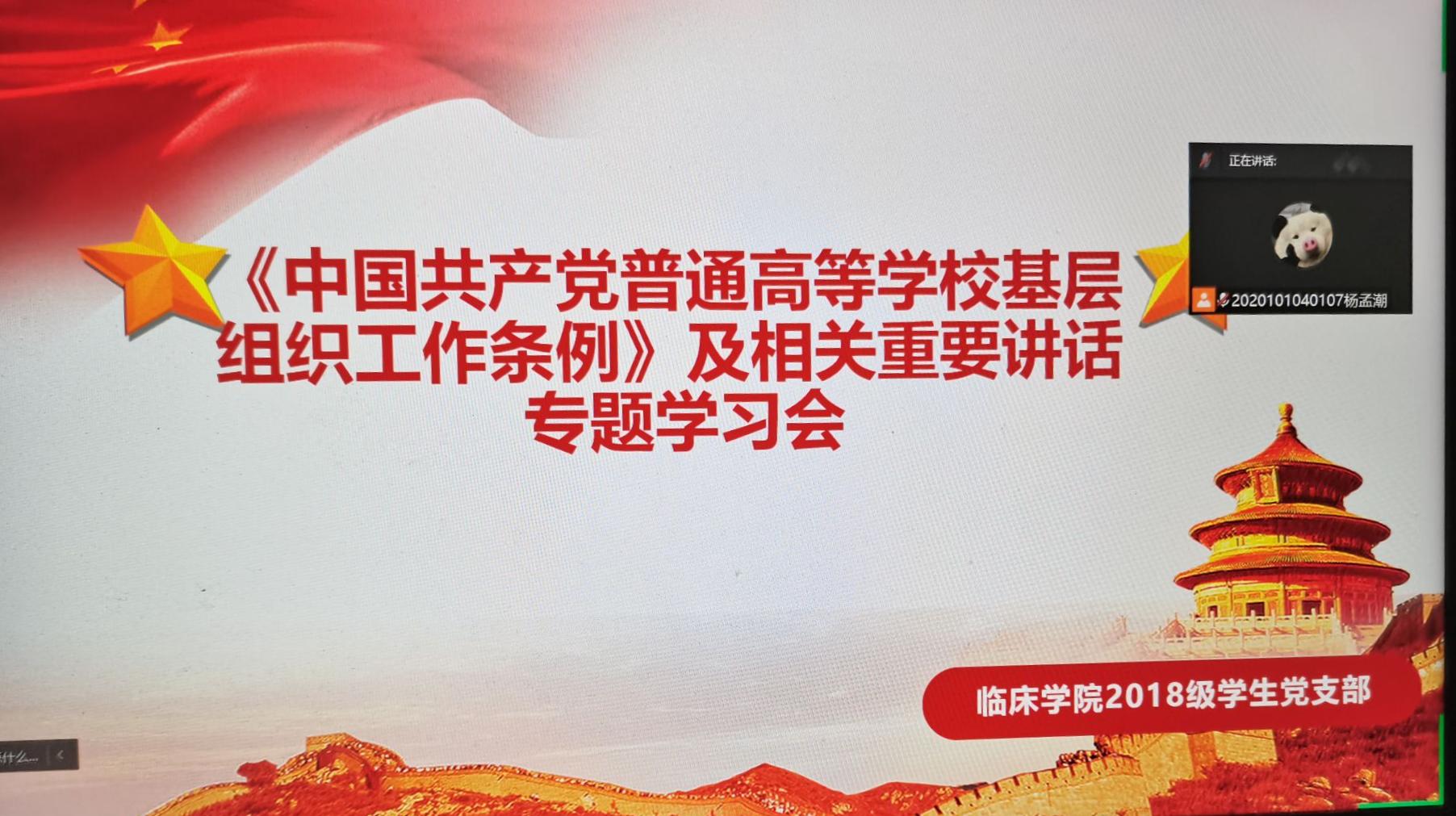 《中国共产党普通高等学校基层组织工作条例》的修订和实施,对于全面贯彻党的教育方针,落实立德树人根本任务,建设高质量教育体系、建设教育强国,具有重要意义。为培育和践行社会主义核心价值观融入大学生思想政治教育工作,临床学院2018级学生党支部于2021年10月14日学习了《中国共产党普通高等学校基层组织工作条例》、王沪宁在第二十七次全国高校党的建设工作会议中的讲话和王东峰在河北省高校党的建设工作会议中的讲话。临床学院2018级学生党支部全体师生党员参加本次活动。 (点击每张图片即可查看原图)