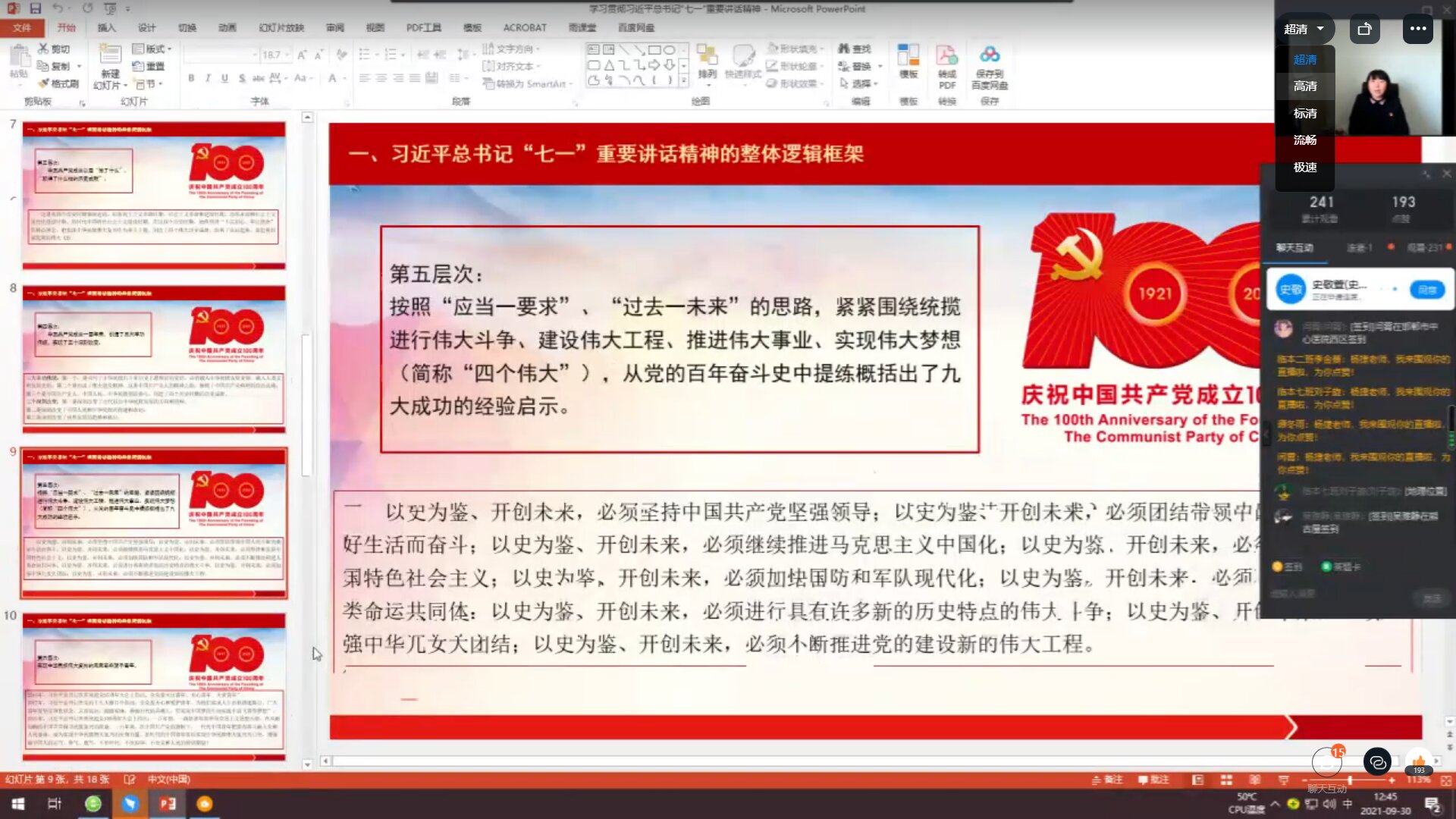 本次专题宣讲由临床学院2017级学生党支部书记杨捷主持。李静的宣讲紧扣主题、脉络清晰、论述透彻、深入浅出、通俗易懂,从百年大党向全世界作出五个“庄严宣告”,中国共产党诞生的历史必然性和必要性,中国共产党成立以后取得了什么样的历史成就,党的百年奋斗史中提练概括出的九大成功经验启示等方面分析解读。