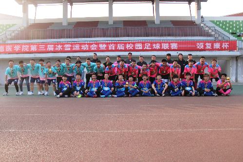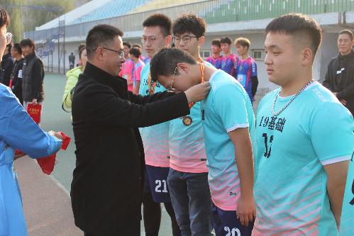 教职工队与学生冠军队表演赛 赛后举行了颁奖仪式,张凯、刘井利、公共体育部及学生处负责人分别为获奖参赛队颁奖。本次比赛不仅增强了学生的体育技能、强健了体魄,培养了政治坚定、仁爱至诚、敬佑生命、甘于奉献的承医精神,更生动践行了我校知行合一的办学理念,全面推进了学校的素质教育,促进了学生的健康发展。