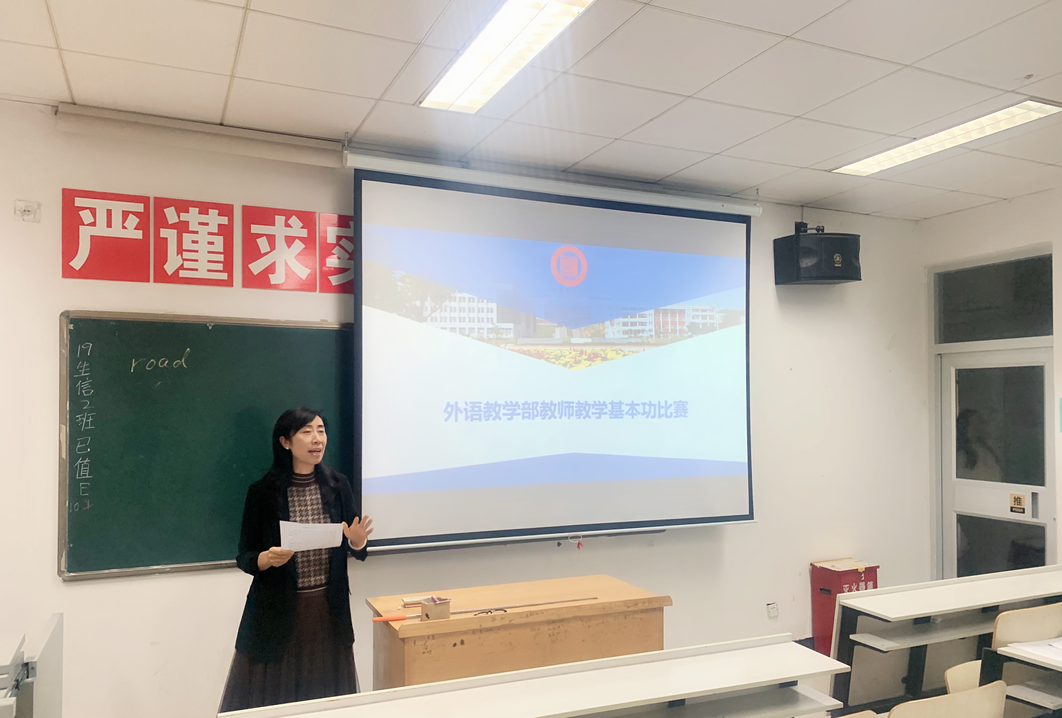 外语教学部主任益文杰致开幕词并介绍了比赛规则 外语教学部主任益文杰致开幕词并介绍了比赛规则。本次比赛由外语教学部主任、副主任及曾经参加过校级及以上教学比赛并有着丰富教学经验的四名专任教师担任评委,外语教学部全体无教学任务的教师观摩了本次比赛并就选手表现提出了宝贵的意见建议。本届教学基本功比赛范围广,涵盖青年教师5名,中年教师2名,共计7名教师参加比赛。参赛教师发音标准,教案详实,课件精美,教态端庄,教风突出,充分体现了外语教学部中青年教师课堂教育教学水平。