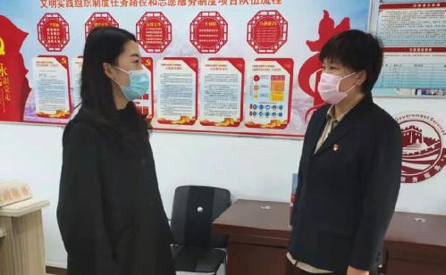 护理系学生第一党支部书记魏荣荣向社区党支部书记谢丹介绍活动内容安排