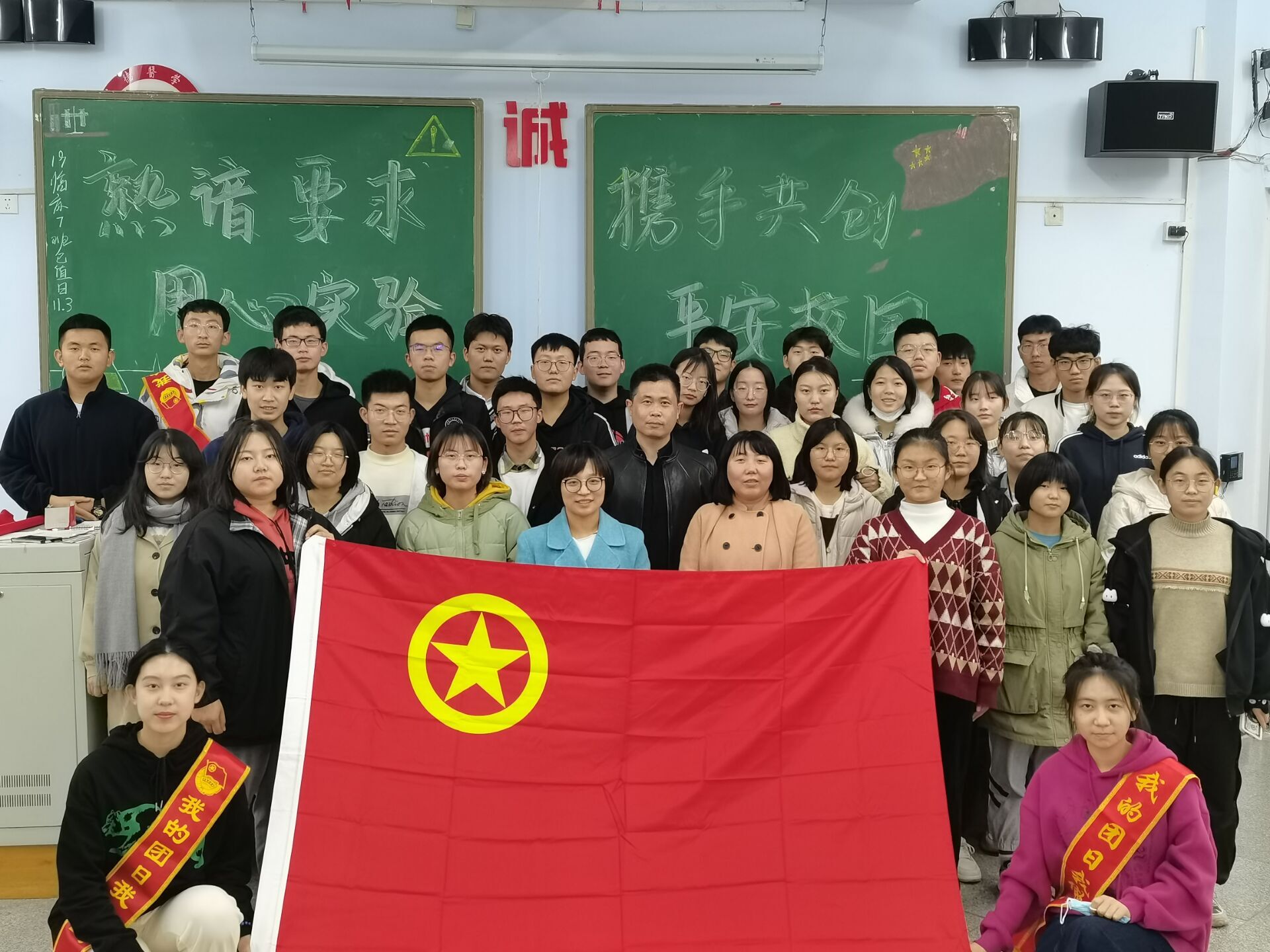 全体师生展团旗,唱团歌 团员们展团旗、唱团歌,重温入团誓词。薛晶向同学们讲述了实验室安全规范,说明了进入实验室前的着装要求、处理简单安全问题的方法措施,还对团员们就实验室问题做出了要求:态度严谨,不容忽视。随后她播放了一段实验室安全视频,向同学们展示了实验室中的不当操作引起的事故,使团员们对实验室不当操作所产生的危害有了更加深刻认识。在互动环节,团员们积极指出平时在实验室操作中的问题,并进行热烈讨论。