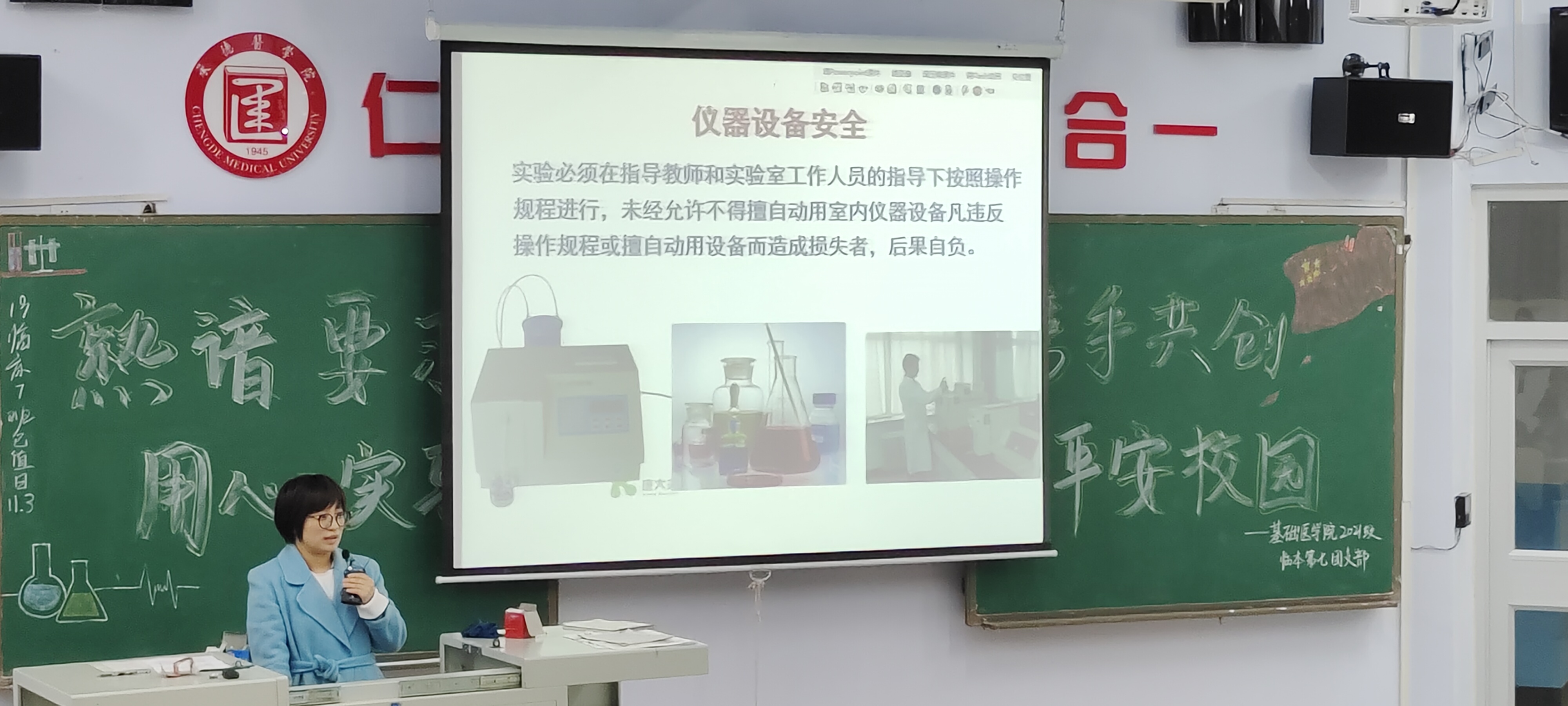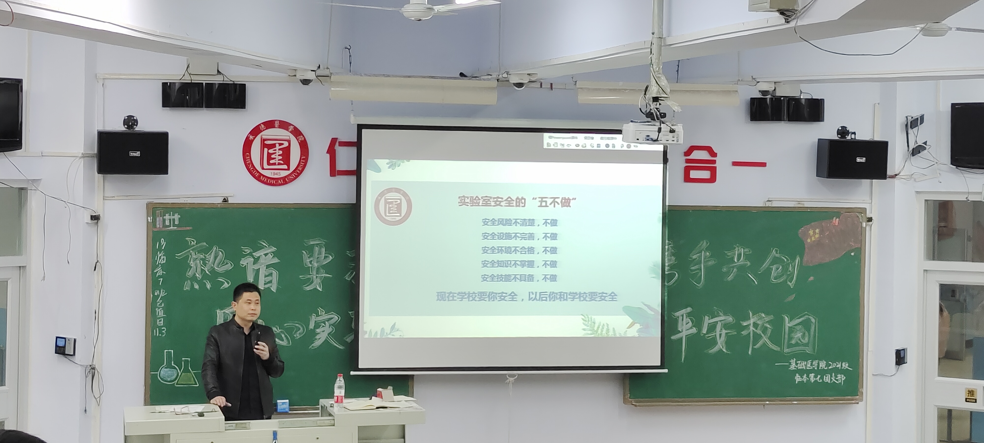 为进一步增强学生的实验室安全规范意识,丰富学生实验室安全知识,熟悉实验室安全措施装置摆放位置以及使用方式,减少人身伤害以及由安全意识薄弱造成的安全事故,2021年11月4日,基础医学院2021级临床医学系第七团支部于教学楼104教室举办“熟谙要求用心实验,携手共创平安校园”主题团日活动。国有资产与实验室管理处副处长王英杰出席活动,基础医学院教师薛晶、李静及临床医学系2021级二大班全体同学。 (点击每张图片即可查看原图)