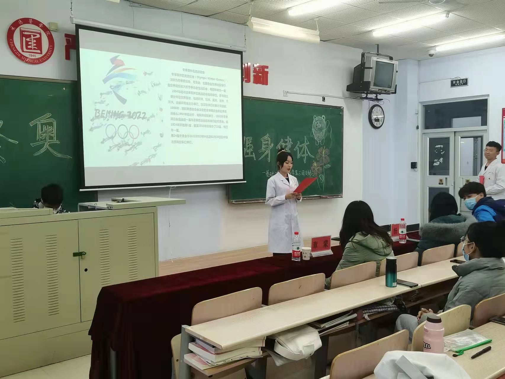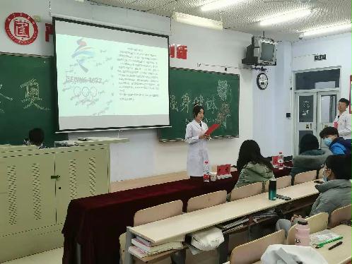 为深入贯彻落实党的十九届五中全会精神和习近平总书记关于冬奥会筹办系列重要指示精神,激发学生对冰雪运动的兴趣,促进学生全面发展,基础医学院2021级麻醉学第三团支部于2021年11月11日在教学楼开展“喜迎冬奥,强身健体”主题团日活动。基础医学院2021级第二学生工作办公室辅导员老师翟冰峰、杨言、章蒙及我校冬奥会志愿者骨干金桐萱参加本次活动。 活动正式开始前,全体成员展团旗,唱团歌,以嘹亮的歌声表达对共青团的热爱。主持人带领大家学习冬奥会知识,并共同了解新时代领路人习近平总书记对我们青年人的寄语,强化同学们在新时代下的历史使命与责任担当。冬奥会学生志愿者金桐萱为同学们介绍冬奥会场馆以及志愿者精神的相关内容,带领同学们进一步了解冬奥精神,感受志愿者肩上背负的责任,同时深刻认识到无论何时何地自己的行为举止不仅代表着个人,更代表国家。为使同学们更好地掌握冬奥会知识,现场开展了互动活动,同学们积极参与,气氛热烈。 (点击每张图片即可查看原图)