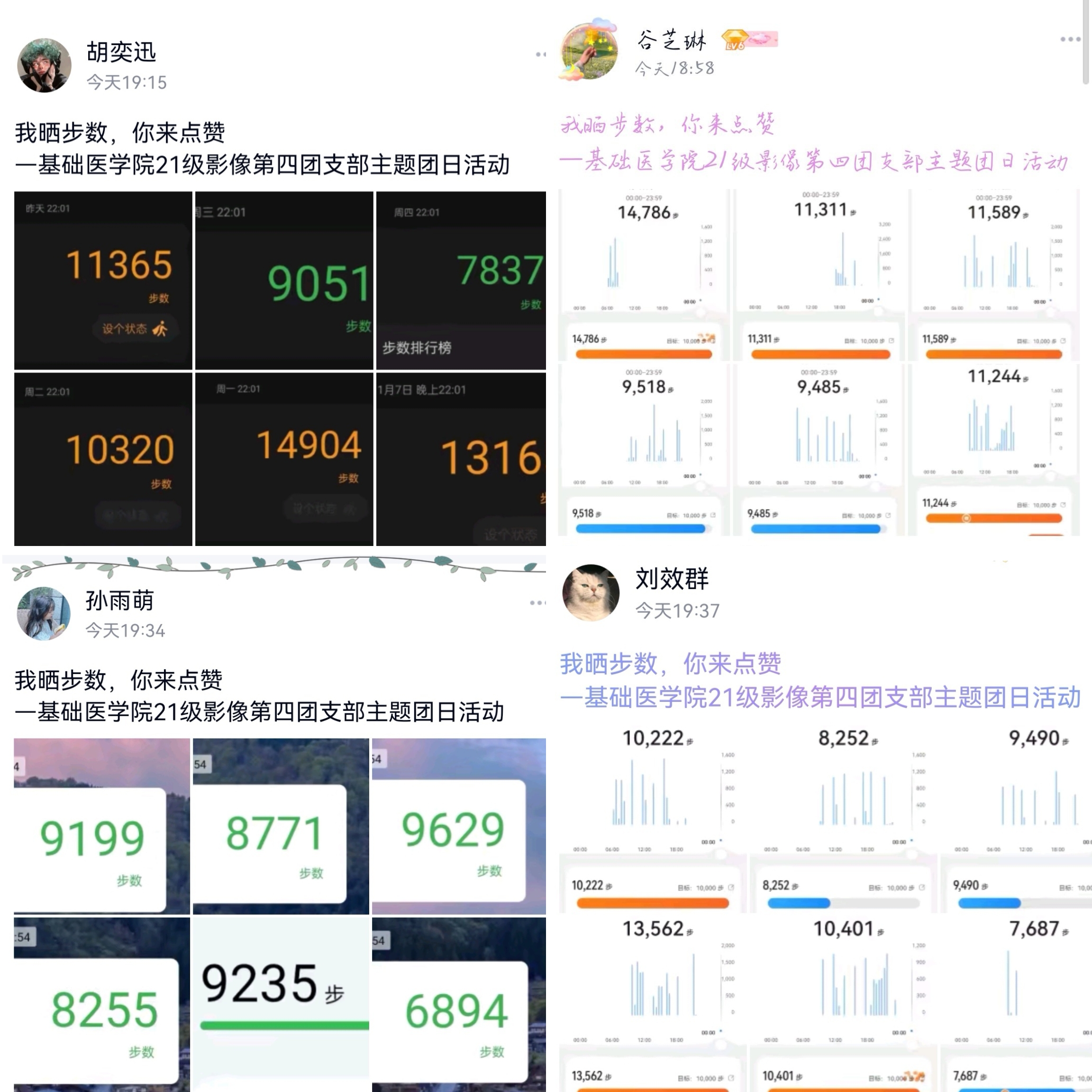 微信步数 11月12日,为继续提高同学们体育锻炼的积极性,增进同学们对体育精神的认同感,团支部开办了“健体魄之强,塑精神之美”主题班会。邀请公共体育教学部体育专项课教研室主任陈阁,基础医学院2021级第二学生工作办公室辅导员老师翟冰峰、章蒙、杨言参加活动。会议伊始,团支部展团旗、唱团歌。接着组织同学们观看奥运混剪,介绍各时期运动健儿事迹。其次对我国现代体育精神进行演讲,引导同学将体育精神联系到生活和学习中。同时为了增强同学们对于体育精神的理解,组织开展了体育知识竞答、奥运主题诗朗诵等活动,以多样化的形式激励同学们体育锻炼,传承中华体育精神。