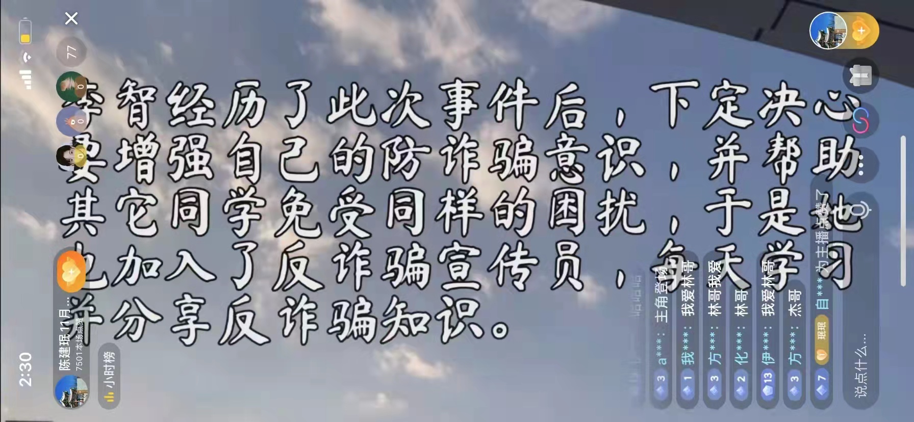 牛圈子沟镇派出所所长宋国兴警官连麦进行防诈宣讲 郭磊、苏泽昭同学连麦进行经验分享,他们通过描述自己或身边同学被诈骗的过程,趣味十足地将犯罪分子的诈骗手段展露在同学们面前,让同学们意识到电信诈骗就在身边,要理智识破不法分子的诈骗手段。在此之后,同学们进行了线上防范诈骗知识答题竞赛,在知识答题竞赛中收获了防范诈骗的知识和技巧。 基础医学院2020级第二团总支副书记陈欣欣分享了自己在校园反诈工作中的感悟和体会,她认为校园反诈工作要常抓不懈,宣讲形式更要与时俱进,同学们原创情景剧《天下无诈》和互动感十足的直播平台,有利于让防范电信诈骗的知识真正入脑入心,也有利于提升高校学生对电信网络诈骗的辨识能力。