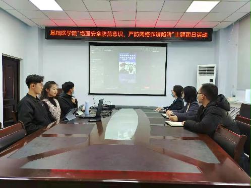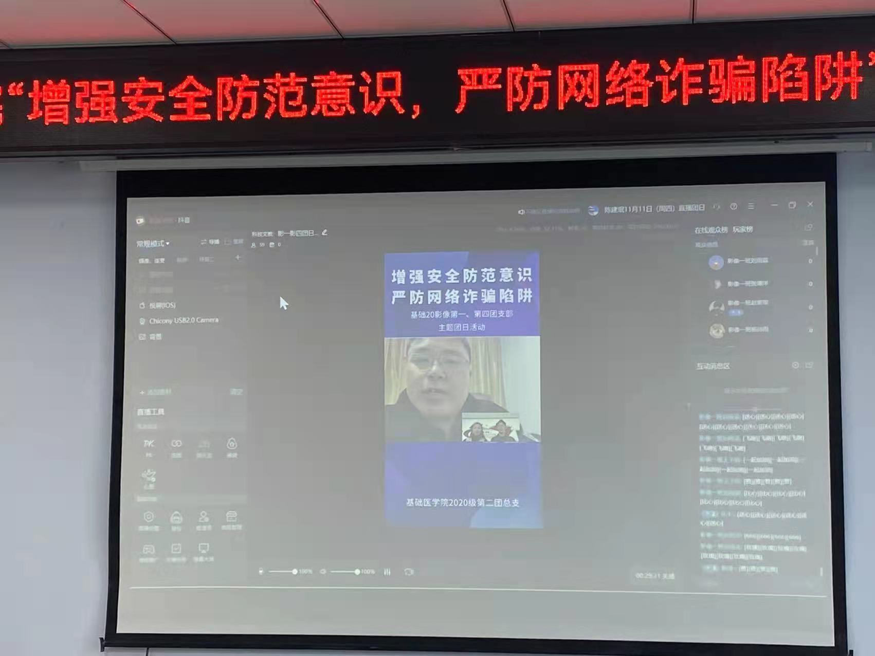 北京4月9日 中共中央总书记、国家主席、中央军委主席习近平对打击治理电信网络诈骗犯罪工作作出重要指示强调,他强调“坚持以人民为中心,全面落实打防管控措施,坚决遏制电信网络诈骗犯罪多发高发态势”。为响应国家号召,提高学生的识骗防骗能力,2021年11月11日,在基础医学院2020级第二团总支精心策划下,20级影像第一与第四团支部合办的以网络直播形式的“增强安全防范意识,严防网络诈骗陷阱”主题团日活动圆满落幕。承德市双桥区牛圈子沟镇派出所所长宋国兴、承德医学院安全工作处处长卢铠锋、基础医学院党委副书记齐菲、基础医学院2020级辅导员陈欣欣、王途与20级影像第一、第四团支部全体学生参加了本次活动。 (点击每张图片即可查看原图)