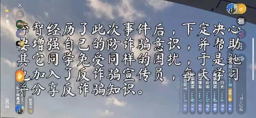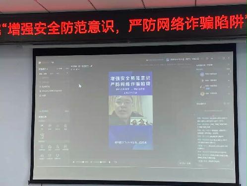 学校安全工作处的分会场 随后播放了由胡钰玮、郎林峰等同学参演的防范电信诈骗情景剧《天下无诈》。剧中大学生“李智”,经骗子一步步诱导,险些落入“刷单”的陷阱中……最后,在一次团日中,她恍然大悟,随即拿起手机拨打了报警电话。此情景剧的编写结合了“国家反诈中心”所给出的近十种常见诈骗手段,剪辑主要运用线性叙事手法,生动形象地展示了一名大学生被骗后的思想和心理状态,让同学们能够很好地“感同身受”,达到警钟长鸣的效果。