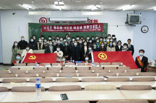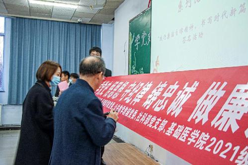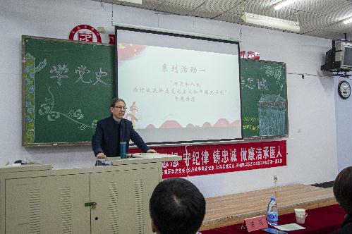 学习党史,可以从中汲取前行的智慧和力量。回顾党的百年征程,党之所以能与群众紧紧相连,离不开其本身所拥有的先进性和纯洁性。清正廉洁的政治本色,更是中国共产党人代代传承的红色基因。为使学生加深对党史的理解,同时也为了更好的弘扬与贯彻廉洁精神,承德医学院纪委、基础医学院党委、公共教学教辅党委、社科部党支部和基础医学院2021级口腔医学第一团支部于11月12日在教学楼联合举办“学党史 悟思想 守纪律 铸忠诚 做廉洁承医人”主题活动。公共教学教辅党委书记李德臣,基础医学院党委书记梁莉、党委副书记齐菲,纪委老师杨明明,公共教学教辅党委组织委员高雅佳,纪检委员、社科部党支部书记吴柏军,专职组织员翟凤敏,社科部党支部组织委员王超,基础医学院2021级第二学生工作办公室辅导员老师翟冰峰、章蒙、杨言参加活动。 本次活动在展团旗、唱团歌中正式拉开帷幕。李德臣以“历史和人民为什么选择马克思主义和中国共产党”为主题进行专题讲座,以深入浅出的语言让同学们对马克思主义和中国共产党有了更深入的了解,更对“为什么历史和人民选择马克思主义和中国共产党”有了更深刻的理解。同时鼓励同学们要更好地学习党史,悟通思想,明理、崇德、增信、力行,积极为健康中国做出应有的贡献。 (点击每张图片即可查看原图)