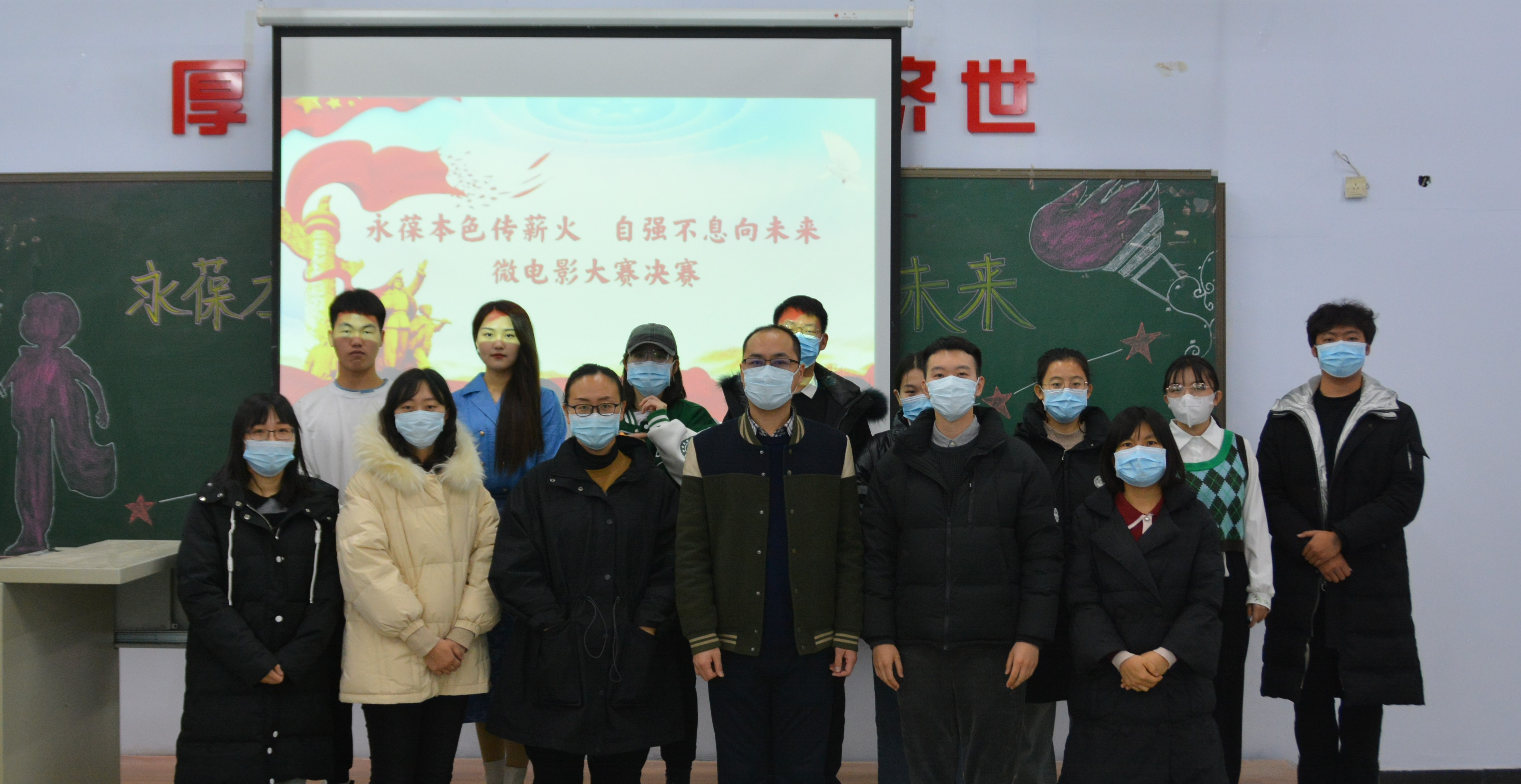 评委老师 此次活动收到了来自全校学生的许多优秀作品,经过之前初赛、网络复赛的筛选和评比,决出九组团队进入决赛。参赛同学以“永葆本色传薪火,自强不息向未来”为主题向我们展示了作为当代大学生所具有的传承薪火、自强不息的精神,深刻感受到党的红色基因已无形中融入我们的生活。每位参赛选手通过自己对红色精神的理解,进行拍摄和剪辑,为我们呈现出精彩绝伦的视频作品。特别是第三组《感受你的百年风华》很好地构建了青年人传承红色精神的美好憧憬与遇到挫折之后展现出的百折不挠精神。第九组《青年觉醒》借鉴了《觉醒年代》片段,由学生自己演绎剪辑,令人为之动容。活动评选出一等奖2队,二等奖4队,三等奖3队。本次比赛由陆宏通老师进行活动总结,赞扬了同学们的作品构思巧妙、叙事流畅、质量高等,同时指出有关微电影拍摄需注意的细节和技术性问题。评委老师和参赛选手合影留念,本次大赛圆满落幕。