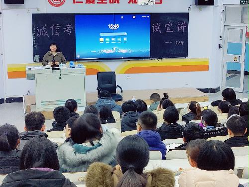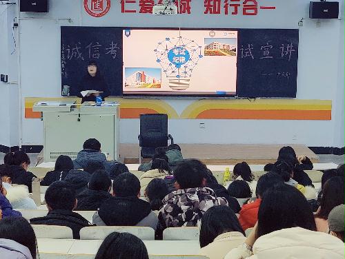为端正考风,严肃考纪,加强学风和考风建设,引导学生践行社会主义核心价值观,弘扬诚信美德,营造文明、诚信考试的良好氛围,基础医学院2021级学生党支部于2021年12月10日邀请我校教务处教学质量管理科负责人史明老师在教学楼为基础医学院2021级临床医学专业学生开展期末诚信考试宣讲活动。参加本次活动的有教务处教学质量管理科史明老师、基础医学院李静老师、罗宇老师以及基础医学院2021级临床医学专业学生。 史明老师开展了诚信考试宣讲。而后,史老师详细地介绍了我校学业考核管理办法,并围绕学业考核管理办法依次介绍我校考试以及试卷运行制度。为加深同学们对课程考核的认识,史老师对课程考核方案及考核形式进行了介绍和讲解。我校的考核形式主要分为形成性评价和终结性评价。形成性评价以课堂测试和平时小测为主要依据,目的是督促同学们勤奋学习,同时调整教师的教学进度。考试的具体组织形式会根据学科的特点分为机考和笔试两种。之后,史老师对命题原则,即难度、区分度、信度、效度四个方面进行了详细的解释,并列举了一些生动的事例,树立了同学们对考试的信心。史老师按照文件《承德医学院学业考核管理办法(试行)第三章考试纪律》对考试纪律进一步解读与宣传。罗宇老师就同学们考试和考场中需要注意的细节问题向同学们阐述,如不得在卷子上做标记、不得将卷子带出考场、有事举手示意老师、以及虽然考试邻近但应在保证身体健康的前提下准备考试等问题。 李静老师进行总结讲话。李老师指出,作为大一的学生一定要养成良好的学风和考风,诚信考试是大学生思想教育过程的重要环节,全体同学要坚守诚信,尊重考试纪律,将“诚实守信”的理念内化于心、外化于行。 本次宣讲活动不仅向大一学生宣传了诚信精神,也解读了承医的考试制度,提高了学生对考试相关要求的认识。基础医学院2021级学生党支部将进一步推进学生诚信法纪教育,把诚信法纪教育作为学生思想道德教育的重要内容,融入日常管理中,为创设优良学风和考风添砖加瓦。 (点击每张图片即可查看原图)