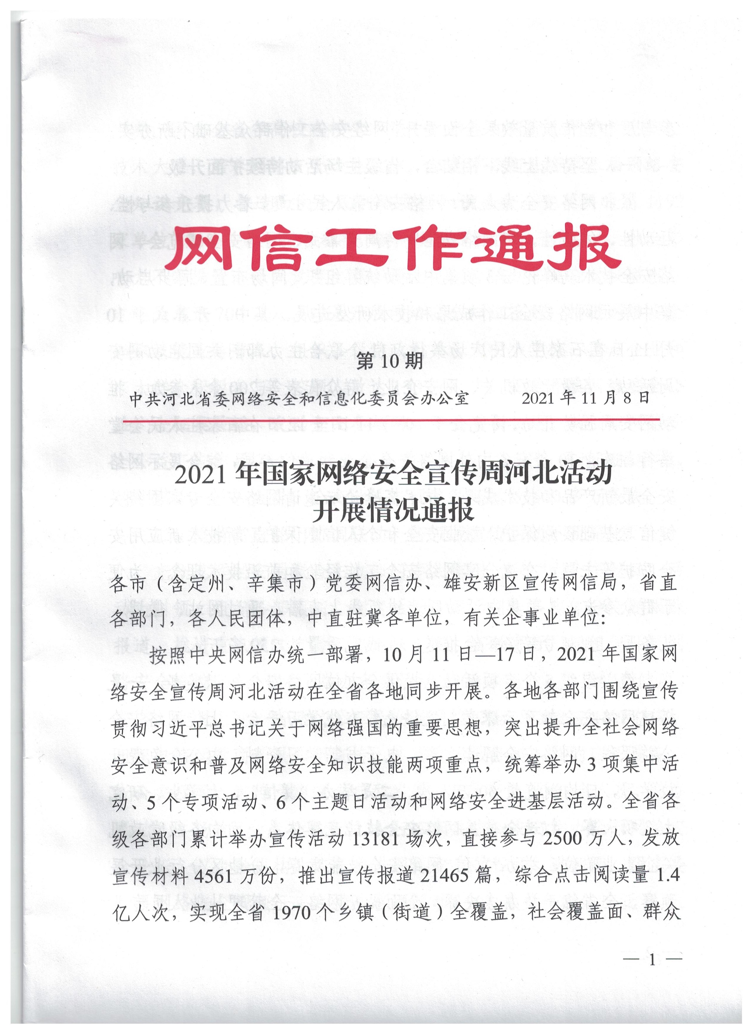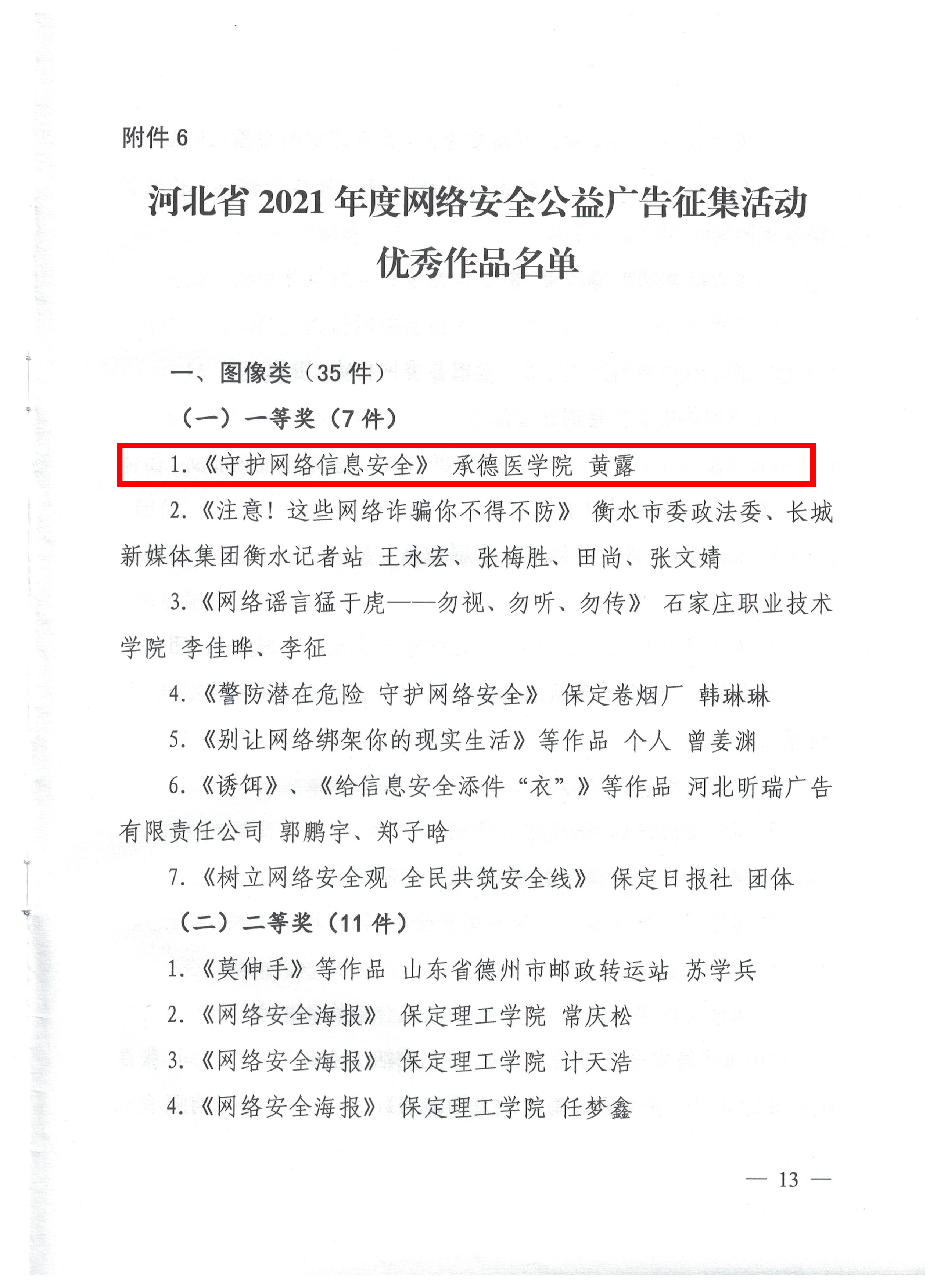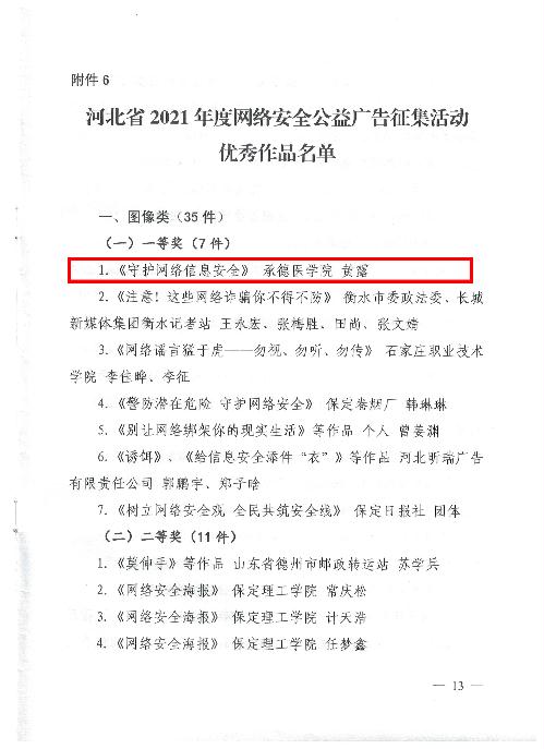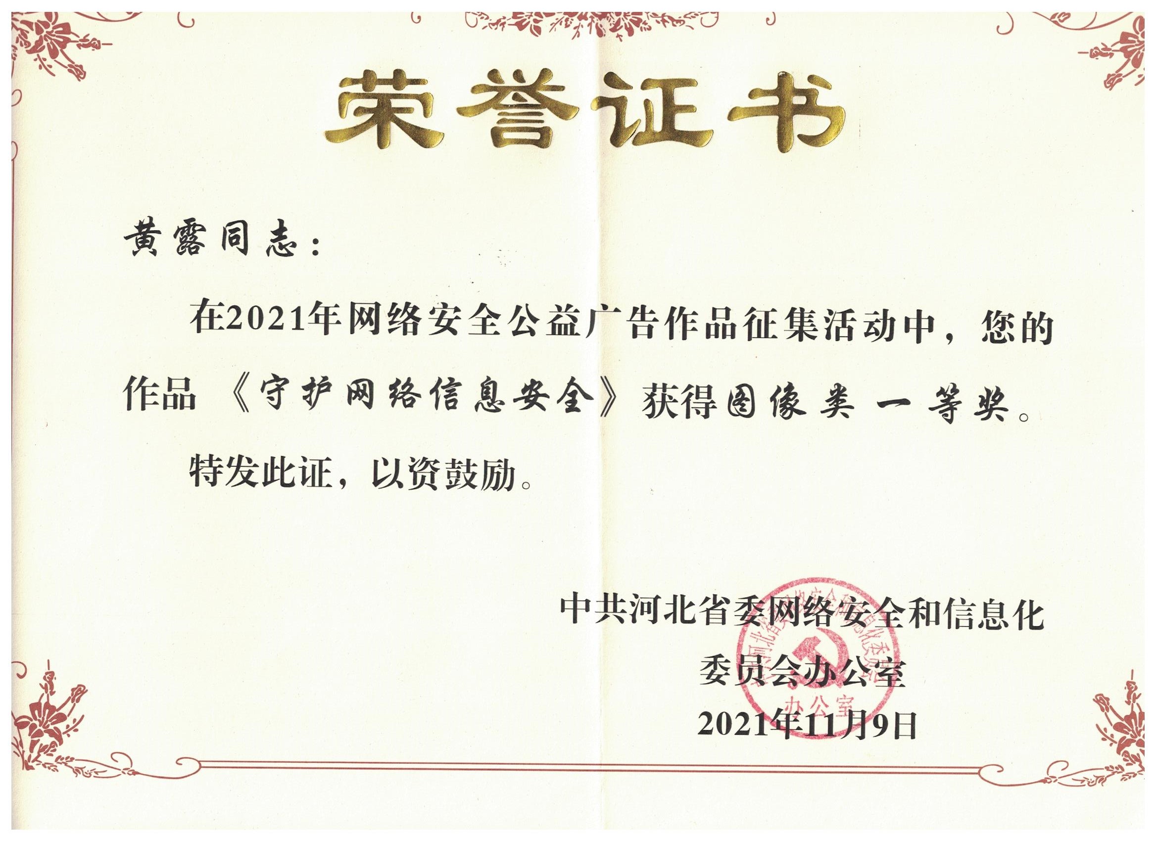 近日,由河北省委网信办组织开展的河北省2021年度网络安全公益广告征集展播活动圆满落幕,我校蚕业研究所教师黄露的《守护网络信息安全》获评图像类作品一等奖。 据悉,本次活动是2021年国家网络安全宣传周河北活动的1个专项活动,由中央网信办统一部署,旨在加强网络安全知识宣传普及,提升全民网络安全意识和技能。活动以“网络安全为人民、网络安全靠人民”为主题,历时5个月,共征集各类型作品764件,评选出优秀获奖作品75件,通过广播电视、网络媒体、户外大屏、公交地铁电视等循环播放600多万条次。 (点击每张图片即可查看原图)