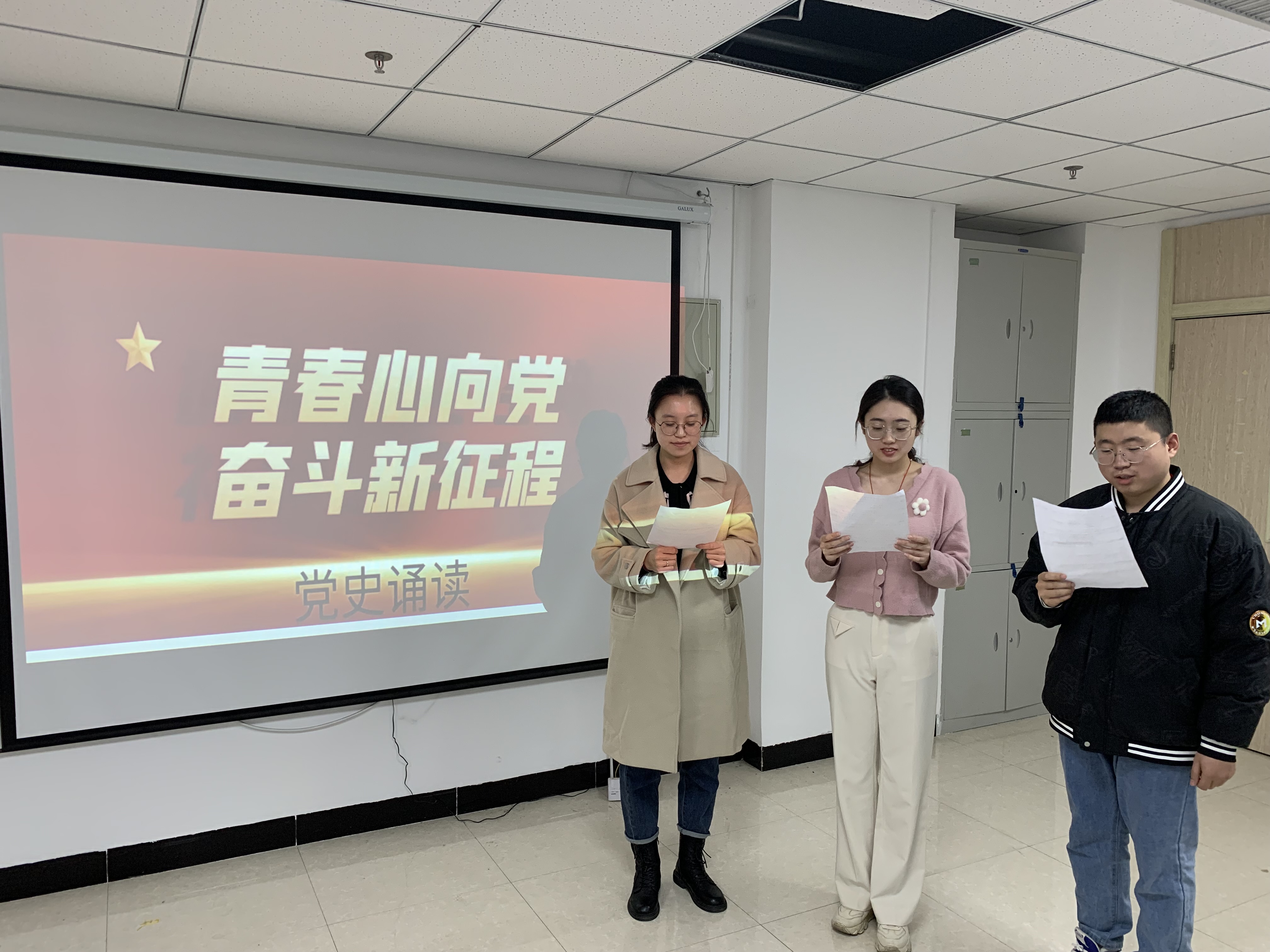主题团课 三位预备党员进行了“青春心向党,奋斗新征程”党史诵读活动。诵读者以满腔豪情和热血追寻伟大中国共产党的足迹,歌颂党史光辉历程,抒发了对伟大中国共产党、伟大祖国的崇敬和热爱,充分展现了青年激情和奋发向上的精神风貌,鼓舞着支部全体成员学党史、强信念、跟党走。