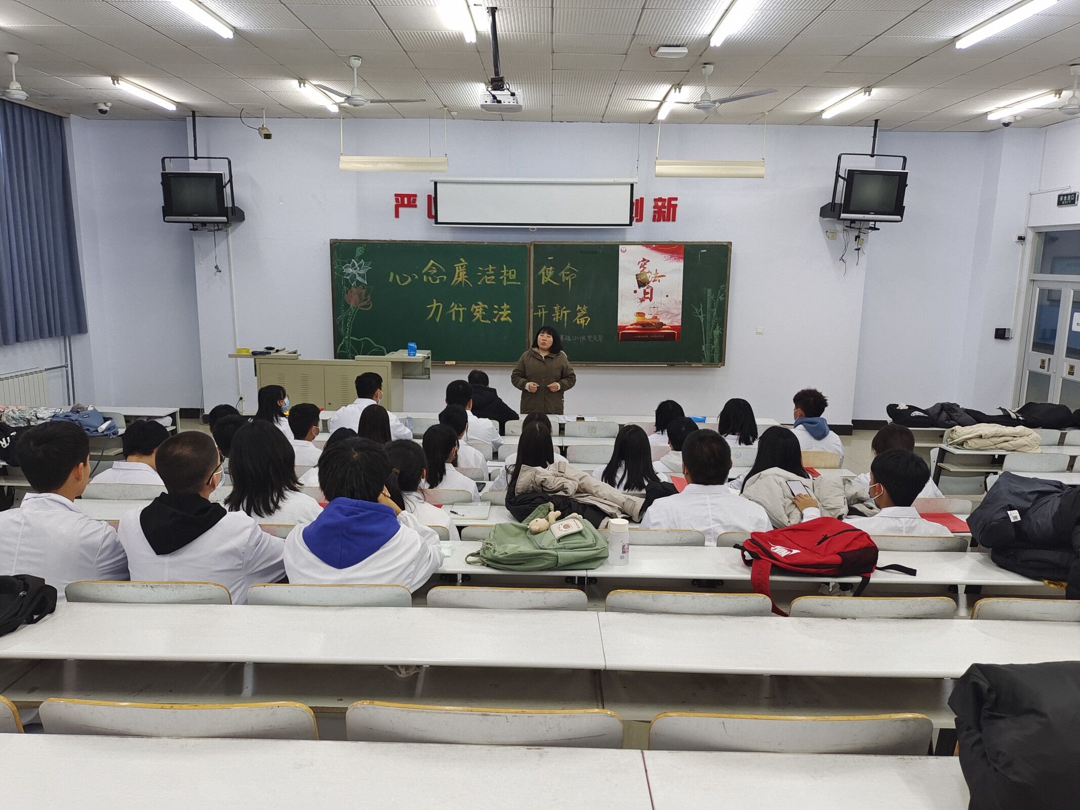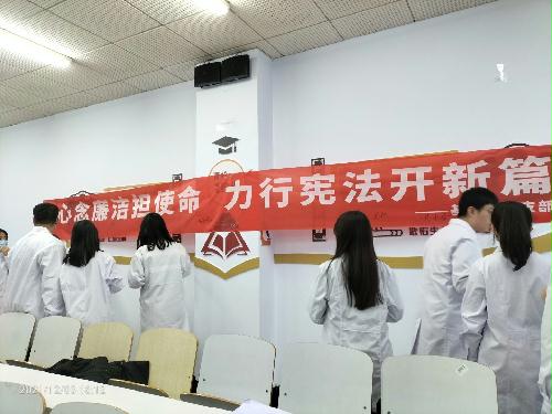 为了深入学习和宣传习近平法治思想,大力弘扬宪法精神,将法治思想刻入每一名学生干部的脑海中。基础医学院2021级学生党支部于2021年12月3日在教学楼210教室召开“心念廉洁担使命,力行宪法开新篇”——“学宪法、倡廉洁、讲诚信”主题教育活动。参与本次活动的有基础医学院李静老师、罗宇老师以及基础医学院2021级部分学生代表。 本次活动主要以宣誓、签名和朗诵经典的形式展开。首先进行的是宪法宣誓签名活动,在学生代表的号召下,同学们踊跃在横幅上签下自己的姓名,表达自己对宪法的崇敬,以及对践行法治精神的信心和成为一个优秀学生的决心;全体成员一起深情朗诵了经典廉洁文化诗篇,每一个字,都是同学们深入肺腑的宣言;每一句话,都是同学们对宪法和法治的信仰。同学们铿锵有力的诵读、认真严谨的态度是同学们对法治观念的理解与支持,建功立业须依法,无限前程旭日升。教育活动第三项由李静老师就学习宪法的重要意义进行讲解。李老师指出宪法是国家的根本大法,统领着中国特色社会主义法律体系,作为一名大学生务必要学习、尊崇、贯彻宪法,要积极践行宪法精神,全面贯彻习近平法治思想,把握核心要义,助力法治中国建设。李静老师结合同学们的学习和生活指出,同学们要自觉遵守法律法规和校规校纪,希望同学们明法守法,懂法善用法。最后,参会成员进行合影留念,本次活动圆满落幕。 基础医学院2021级学生党支部通过本次宪法宣传教育,加强了对学生的普法力度,营造了学生尊崇宪法、学习宪法、运用宪法的良好氛围,推进了学生们法治思维和法治思想的构建。 (点击每张图片即可查看原图)