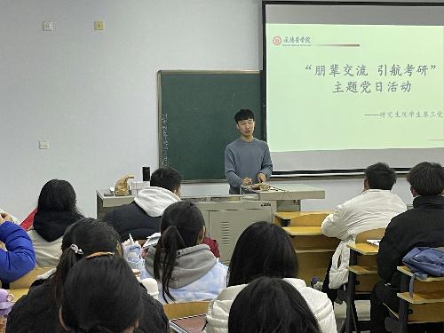 为深入贯彻落实党史学习教育“我为群众办实事”,进一步发挥朋辈榜样的示范引领作用,培养优良学风,激发学习内动力,增进本科生对考研知识和经验的了解,11月25日,研究生学院党委学生第三党支部在实验楼125举行“朋辈交流,引航考研”主题党日活动。 支部党员代表就考研复习方法、考研计划、备考心态的调整、作息时间安排及复试等方面介绍了自身的经验和感悟,让同学们对考研有了更全面的了解和准备。在随后的互动提问环节中,同学们就如何选择学校、考研前期如何准备、考研要求等问题向党员代表进行提问,整个交流会现场气氛热烈、互动密切。 此次党日活动是充分发挥朋辈示范引领作用,实现朋辈之间互帮互助、面对面交流的有效方式,通过主题演讲、互动答疑等形式让同学们了解更多的考研信息,对标优秀榜样,激发学习热情,树立考研信心,从而增强生涯规划意识,明确未来发展路径,珍惜韶华,不负青春,努力为梦想奋力前行。 (点击每张图片即可查看原图)