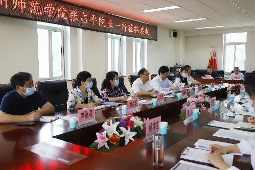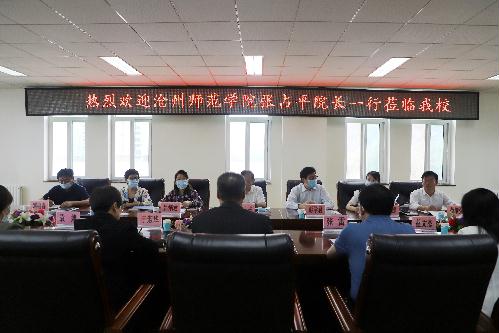 2021年9月15日上午,沧州师范学院院长张占平、副院长彭学君等一行13人来我校考察交流。我校党委书记盛婉玉、校长唐世英接待了沧州师范学院校领导并参加考察交流活动。 (点击文中每张图片即可查看其大图)
