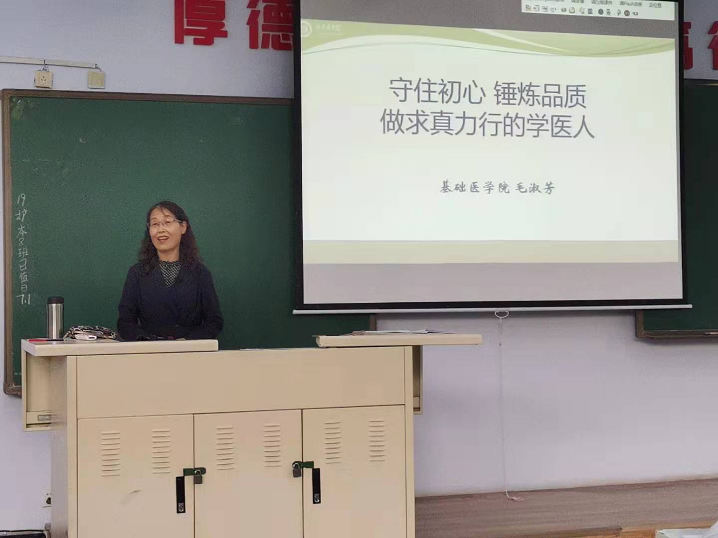 基础医学院院长毛淑芳作“守住初心、锤炼品质,做求真力行的学医人”的宣讲