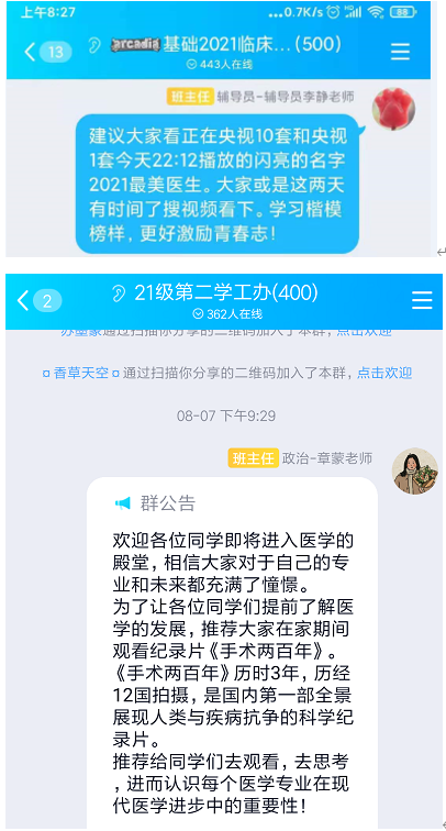 拓宽教育途径,线上资源领航成长。基础医学院高度重视学生的医德医风教育,结合线上资源,自8月中旬至今,学院党委副书记齐菲与辅导员老师们通过新生工作群和学习群持续开展医德医风教育,给学生推荐2021中国最美医生发布会、《医者仁心》《医者》等纪录片,教育学生坚持以患者的健康福祉为重,以术治人,以德服人,以情化人,通过良好的医德医术,继续深耕医学领域,传播医者大爱,切实增强新生的使命感和担当感。