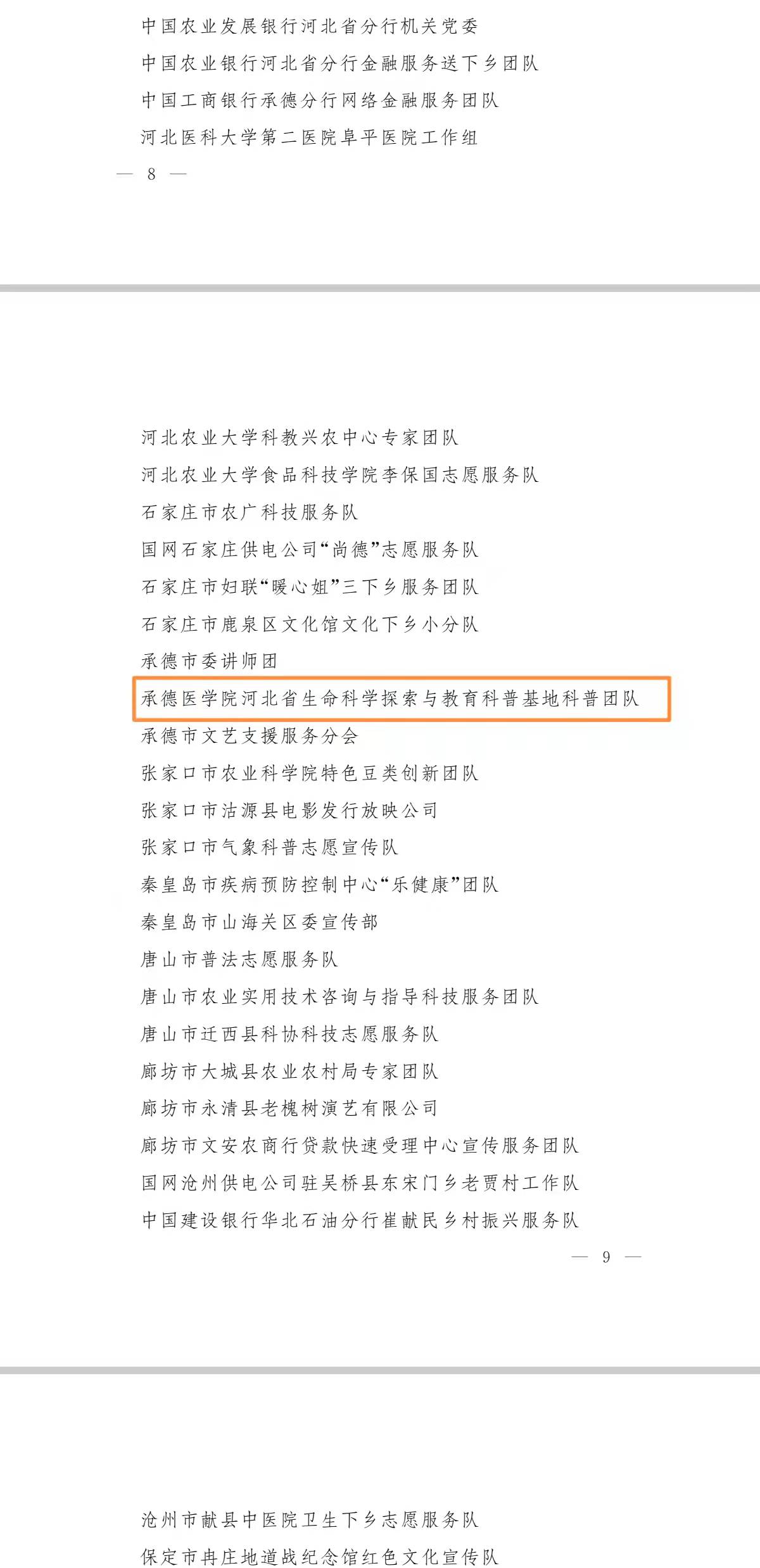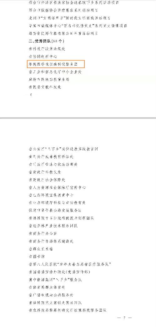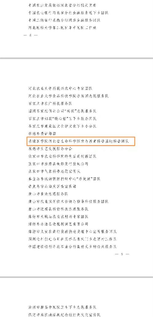 河北省委宣传部通报表彰2021年全省文化科技卫生“三下乡”活动示范项目、优秀团队等,其中88个优秀团队中我校两个团队同时荣登榜单,分别是“承德医学院桑蚕科技团”和“承德医学院河北省生命科学探索与教育科普基地科普团队”。向获表彰的两个团队表示热烈祝贺。 我校积极参与全省文化科技卫生“三下乡”活动,其中,蚕桑科技团和河北省生命科学探索与教育科普基地团队本着深入基层、服务群众的原则,勇于创新、扎实工作,充分发挥我校学科优势,积极投身社会实践和社会服务,实现了农、药、医多学科融合,在科技服务、研发产出、成果转化等方面取得明显成效。 此次我校蚕桑科技服务团、河北省生命科学探索与教育科普基地科普团队荣获2021年全省文化科技卫生“三下乡”活动优秀团队,不仅展示了我校优秀的团队合作精神,更彰显了我校以昂扬的奋斗姿态走好新的赶考路,拼搏奋进新征程的积极作为,为加快建设现代化经济强省美丽河北贡献更大力量的决心。 (点击每张图片即可查看原图)