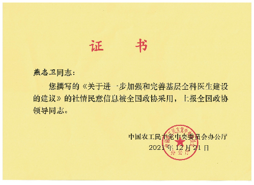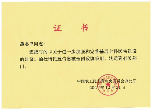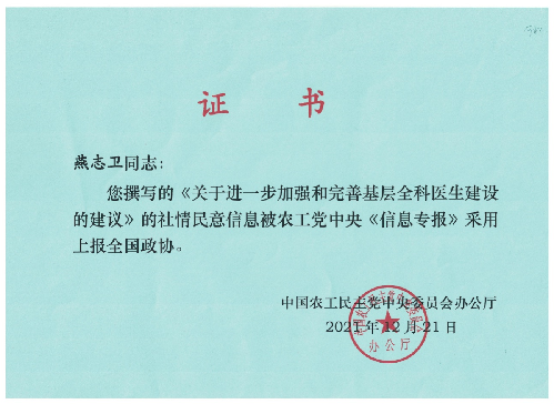 我校中药研究所(中药学系)农工党员教师燕志卫撰写的《关于进一步加强和完善基层全科医生建设的建议》,被农工党中央《信息专报》采用,上报全国政协,全国政协采用,上报领导同志转送相关部门。 燕志卫系我校中药研究所(中药学系)助理研究员,自入职以来,得到各级领导关怀和同事们的帮助,专心科研,勤奋努力、潜精研思、深耕笃行,参与了多项国家级、省级、厅局级课题的申报和结题工作,发表学术论文10余篇。2020年12月,燕志卫加入中国农工民主党,在农工党承德市委会领导的指导和帮助下积极撰写社情民意信息。2021年结合自己十几年的农村生活经历,亲历并见证了基层全科医生建设所取得的巨大成就,也发现当前基层全科医生建设所面临的各种弊端,在深入调查研究的基础上撰写了《关于进一步加强和完善基层全科医生建设的建议》,提交相关部门。 此次燕志卫提交的社情民意信息被农工党中央《信息专报》采用,上报全国政协,被全国政协采用,上报领导同志转送相关部门,是我校教师参政议政、建言献策方面的重大突破,向燕志卫老师表示祝贺! (点击每张图片即可查看原图)
