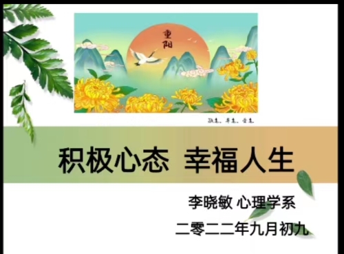 老党员摄影作品 “积极心态,幸福人生”健康知识大讲堂微课堂 重阳节来临之际,离退休党委开展“情暖重阳送健康”暖心行动,邀请心理学系主任李晓敏教授为大家录制了《积极心态,幸福人生》微课。李晓敏从心理学专业角度结合老同志健康实际,通过生动的案例分析,深入浅出的剖析阐述,举例子、打比喻,图文并茂地为大家奉献一场精彩的心理健康辅导,鼓励大家“眼要亮、嘴要甜、耳要听、心要宽、手要放”。老同志们非常喜欢,纷纷转发家庭群,与家人分享,共同培树阳光心态,健康幸福乐享人生。