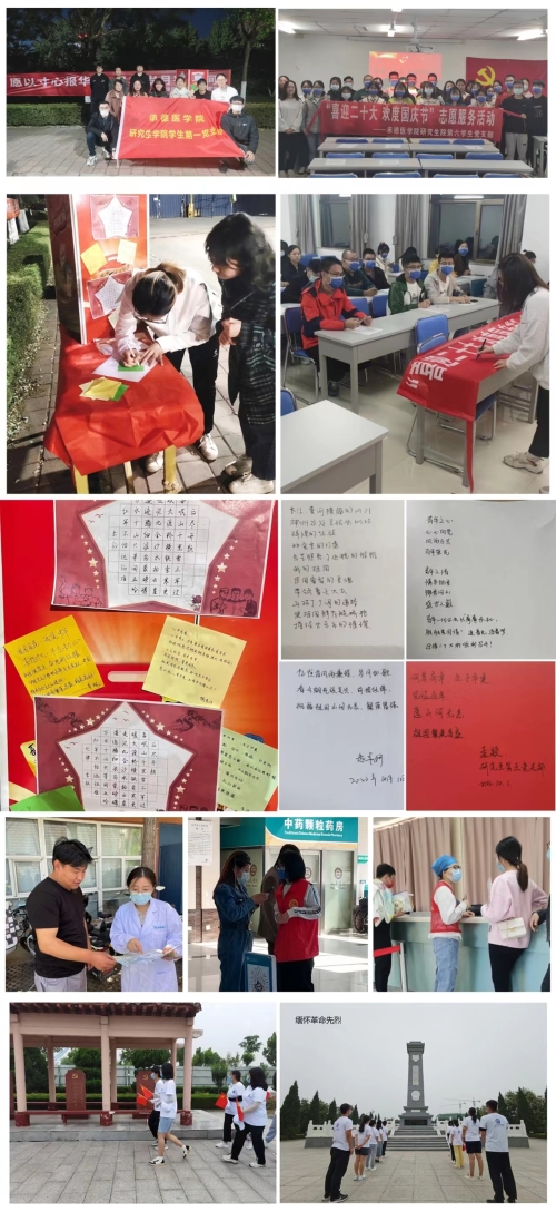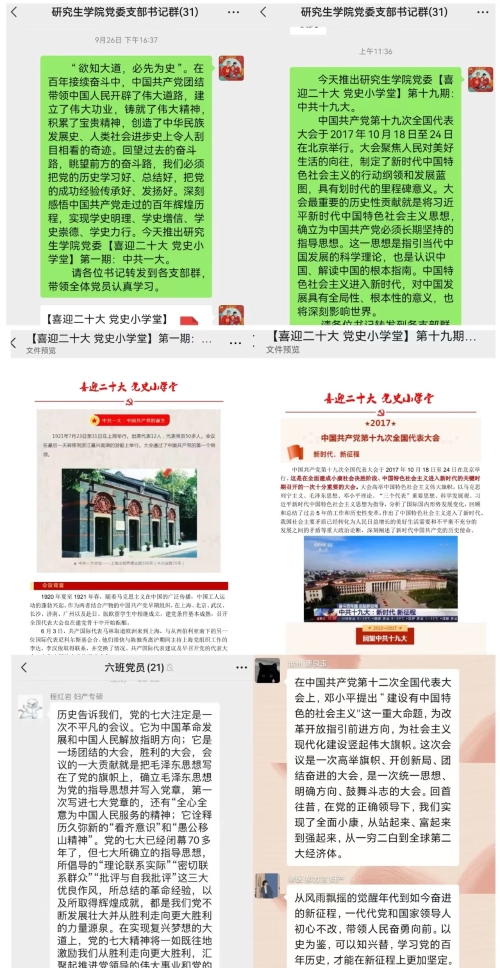 开展“喜迎二十大 党史小学堂”学习教育 开展“喜迎二十大 党史小学堂”学习教育。自9月26日起,学院党委每日制作一期关于党的代表大会的党史知识推送给全体党员,通过视频会议、集中学习等形式进行深入学习。通过理论学习和思想交流,全体党员进一步了解党的历次代表大会的历史意义,对党的二十大召开满怀信心、满怀期待,为迎接党的二十大胜利召开营造了浓厚氛围。 开展“喜迎二十大 欢度国庆节”主题党日。国庆节期间,研究生学院各学生党支部以党建带团建,开展丰富多样的党日活动:学生党员们通过签名寄语和手写祝福的方式,庆祝祖国生日,表达对祖国美好的祝愿;发挥专业优势,走进医院、走进社区、走进群众,开展健康知识宣传和送医送药等志愿服务;重温入党誓词、观看红色电影,到烈士陵园扫墓缅怀革命先烈。丰富多彩的党日活动,使学生们在节日的氛围中进一步增强了爱党爱国情怀。