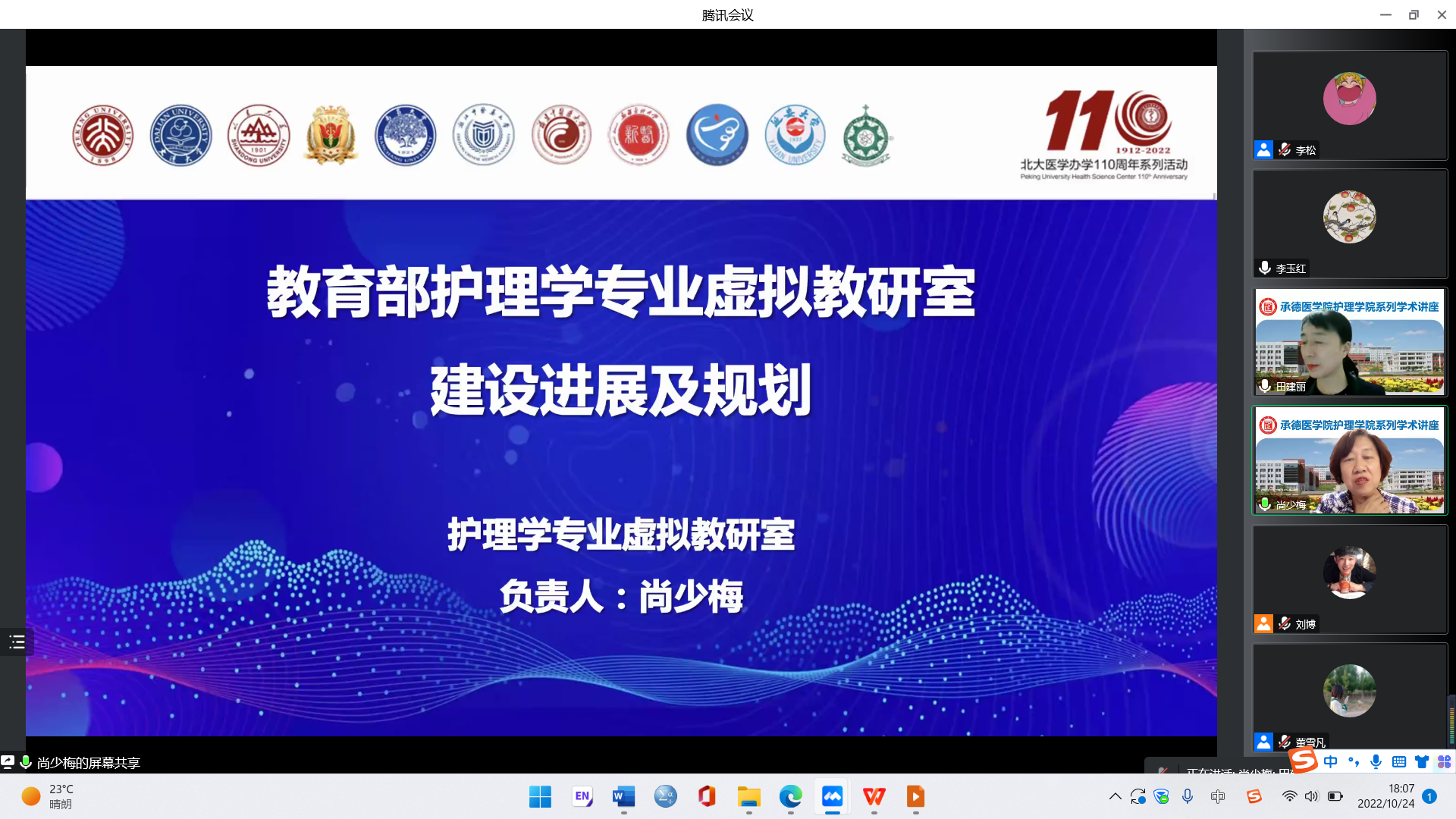 2022年10月24日18:00,护理系邀请北京大学护理学院院长、博士生导师、美国护理科学院院士尚少梅教授,以腾讯会议的形式,开展题为《虚拟教研室建设》的学术讲座。会议由护理系主任田建丽主持,特邀学校党委常委、副校长李玉红致欢迎辞。李玉红对尚少梅院长的到来表示诚挚的欢迎,感谢尚少梅院长作为教指委主委,多年来对我校护理学科的发展和护理学专业建设工作给予的大力支持与指导,希望今后能够邀请尚少梅院长到我校莅临指导。护理系全体教师、研究生导师及研究生参会。 (点击每张图片即可查看原图)