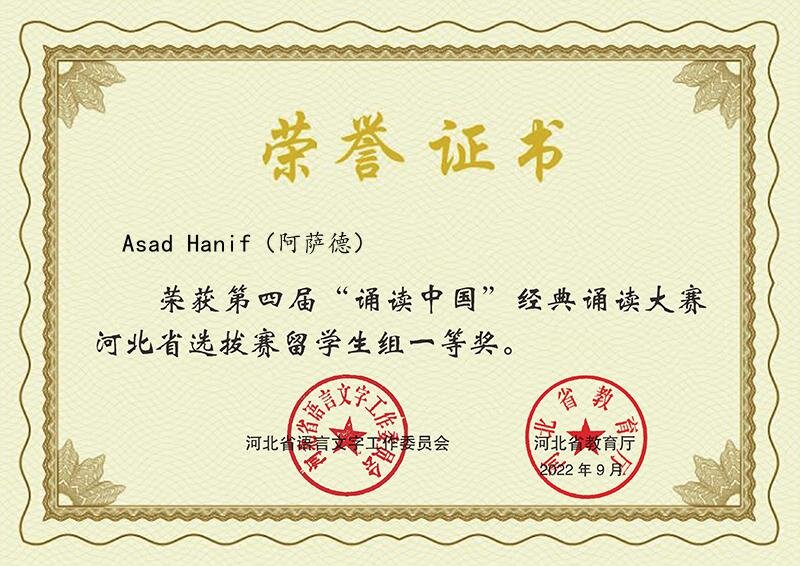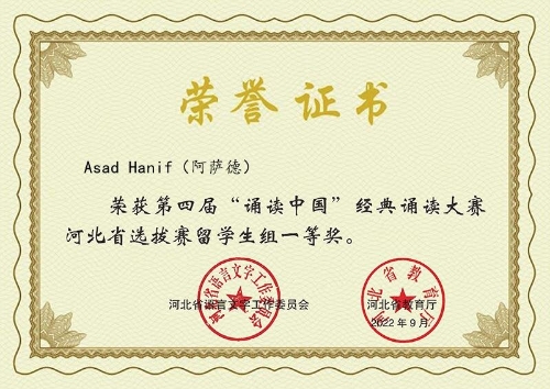 乔媛媛、郭淳、李牧乘获得优秀指导教师奖 2022年4月至6月,为传承中华优秀传统文化,弘扬中国精神,彰显中华语言文化魅力,由河北省语委、教育厅组织的第四届中华经典诵写讲大赛“诵读中国”经典诵读大赛河北省选拔赛与我校第四届留学生“诵读中国”经典诵读大赛校级选拔赛同步启动。经过校级选拔赛的比拼,国际教育学院推选了获得一等奖的3部留学生作品代表我校参加河北省选拔赛。目前,3部留学生作品均入围全国复赛。